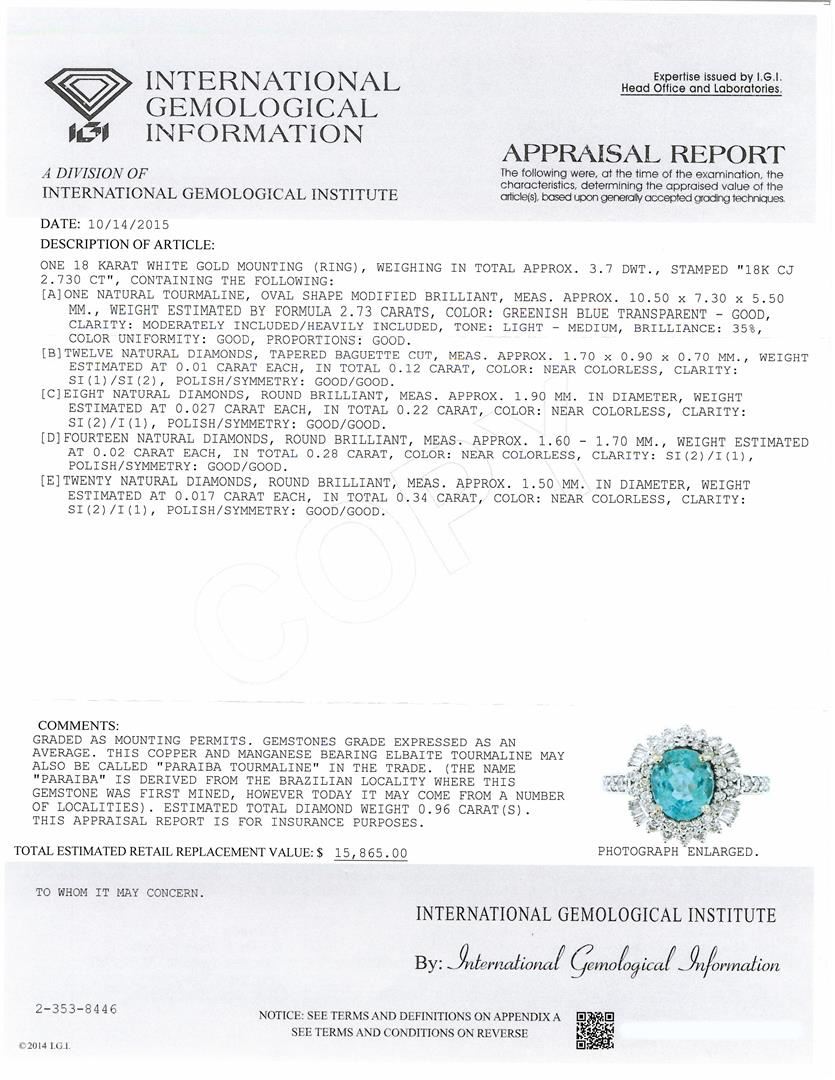 One 18KT white gold ring, weighing in total approx. 3.7 dwt., stamped "18K CJ 2.730", containing the following: One natural paraiba tourmaline, oval shape modified brilliant, measuring approx. 10.50 x 7.30 x 5.50 mm, weight estimated by formula 2.73ct, color: greenish blue transparent - good, clarity: moderately included/heavily included, tone: light - medium, brilliance: 35%, color uniformity: good, proportions: good. Twelve natural diamonds, tapered baguette cut, measuring approx. 1.70 x 0.90 x 0.70 mm, weight estimated at 0.01ct each, in total 0.12ct, color: near colorless, clarity: SI1/SI2, polish/symmetry: good/good. Eight natural diamonds, round brilliant, measuring approx. 1.90 mm in diameter, weight estimated at 0.027ct each, in total 0.22ct, color: near colorless, clarity: SI2/I1, polish/symmetry: good/good. Fourteen natural diamonds, round brilliant, measuring approx. 1.60 - 1.70 mm, weight estimated at 0.02ct each, in total 0.28ct, color: near colorless, clarity: SI2/I1, polish/symmetry: good/good. Twenty natural diamonds, round brilliant, measuring approx. 1.50 mm in diameter, weight estimated at 0.017ct each, in total 0.34ct, color: near colorless, clarity: SI2/I1, polish/symmetry: good/good. IGI Appraised at $15,865.00.