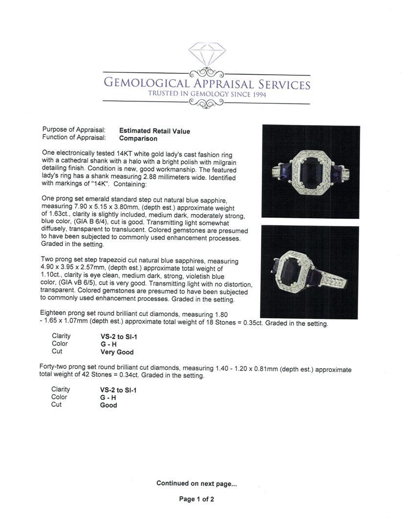 One electronically tested 14KT white gold lady's cast fashion ring with a cathedral shank with a halo with a bright polish with milgrain detailing finish. The featured lady's ring has a shank measuring 2.88 millimeters wide. Identified with markings of '14K'. Condition is new, good workmanship. Containing: One prong set emerald standard step cut natural blue sapphire, measuring 7.90 x 5.15 x 3.80mm, (depth est.) approximate weight of 1.63ct., clarity is slightly included, medium dark, moderately strong, blue color, (GIA B 6/4), cut is good. Transmitting light somewhat diffusely, transparent to translucent. Colored gemstones are presumed to have been subjected to commonly used enhancement processes. Graded in the setting. Two prong set step trapezoid cut natural blue sapphires, measuring 4.90 x 3.95 x 2.57mm, (depth est.) approximate total weight of 1.10ct., clarity is eye clean, medium dark, strong, violetish blue color, (GIA vB 6/5), cut is very good. Transmitting light with no distortion, transparent. Colored gemstones are presumed to have been subjected to commonly used enhancement processes. Graded in the setting. Eighteen prong set round brilliant cut diamonds, measuring 1.80 - 1.65 x 1.07mm (depth est.) approximate total weight of 18 Stones = 0.35ct. Graded in the setting. Clarity VS-2 to SI-1. Color: G - H Cut Very Good Forty-Two prong set round brilliant cut diamonds, measuring 1.40 - 1.20 x 0.81mm (depth est.) approximate total weight of 42 Stones = 0.34ct. Graded in the setting. Clarity VS-2 to SI-1. Color: G - H Cut Good Eight prong set round brilliant cut diamonds, measuring 0.90 - 0.85 x 0.54mm (depth est.) approximate total weight of 8 Stones = 0.02ct. Graded in the setting. Clarity VS-2 to SI-1. Color: G - H Cut Good. Total Weight of Colored Stones 2.73ct.. Total Weight of Diamonds 0.71ct.. Total Weight of Ring 8.10gm. GAS Appraised at $7,715.00.