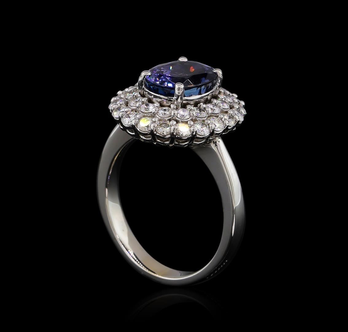 One electronically tested 14KT white gold lady's cast fashion ring with a basket double halo with a bright polish finish. The featured lady's ring has a shank measuring 3.14 millimeters wide. Identified with markings of "K14". Condition is new, good workmanship. Containing: One prong set oval modified brilliant cut natural tanzanite, measuring 9.25 x 7.24 x 5.81mm, approximate weight of 2.73ct., clarity is eye clean, type I, medium, moderately strong, bluish violet color, (GIA bV 5/4), cut is very good. Transmitting light with no distortion, transparent. Colored gemstones are presumed to have been subjected to commonly used enhancement processes. Graded in the setting. Twenty prong set round brilliant cut diamonds, measuring 2.10 - 2.00 x 1.27mm (depth est.) approximate total weight of 20 Stones = 0.67ct. Graded in the setting. Clarity: SI-1 to I-1. Color: H - I. Cut Good Sixteen prong set round brilliant cut diamonds, measuring 1.90 - 1.80 x 1.15mm (depth est.) approximate total weight of 16 Stones = 0.40ct. Graded in the setting. Clarity: SI-1 to I-1. Color: G - I. Cut Good. Total Weight of Colored Stones 2.73ct. Total Weight of Diamonds 1.07ct. Total Weight of Ring 6.20gm GAS Appraised.