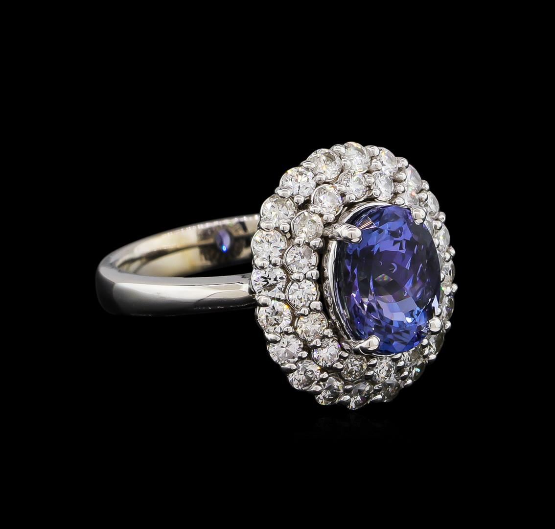 One electronically tested 14KT white gold lady's cast fashion ring with a basket double halo with a bright polish finish. The featured lady's ring has a shank measuring 3.14 millimeters wide. Identified with markings of "K14". Condition is new, good workmanship. Containing: One prong set oval modified brilliant cut natural tanzanite, measuring 9.25 x 7.24 x 5.81mm, approximate weight of 2.73ct., clarity is eye clean, type I, medium, moderately strong, bluish violet color, (GIA bV 5/4), cut is very good. Transmitting light with no distortion, transparent. Colored gemstones are presumed to have been subjected to commonly used enhancement processes. Graded in the setting. Twenty prong set round brilliant cut diamonds, measuring 2.10 - 2.00 x 1.27mm (depth est.) approximate total weight of 20 Stones = 0.67ct. Graded in the setting. Clarity: SI-1 to I-1. Color: H - I. Cut Good Sixteen prong set round brilliant cut diamonds, measuring 1.90 - 1.80 x 1.15mm (depth est.) approximate total weight of 16 Stones = 0.40ct. Graded in the setting. Clarity: SI-1 to I-1. Color: G - I. Cut Good. Total Weight of Colored Stones 2.73ct. Total Weight of Diamonds 1.07ct. Total Weight of Ring 6.20gm GAS Appraised.