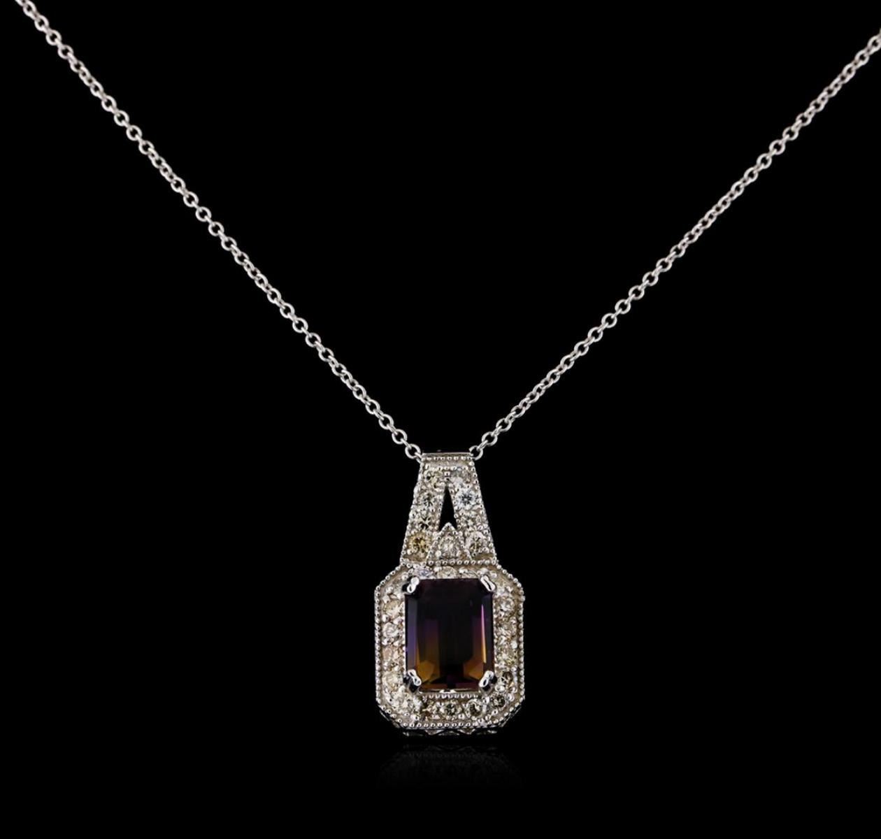 One electronically tested 14KT white gold ladies cast & assembled ametrine and diamond pendant with chain. The featured ametrine is set within a diamond bezel completed by a stylized diamond set hidden bail. The pendant is supported by an eighteen inch length 14KT white gold cable chain, terminating in a lobster claw clasp. Bright polish finish with milgrain detailing. Identified with markings of "K14". Condition is new, good workmanship. Containing: One prong set rectangular step cut natural ametrine quartz, measuring 9.30 x 7.30 x 5.00mm, approximate weight of 2.75ct., clarity is eye clean, type I, medium dark, very slightly grayish, purple color, (GIA P 6/3) to medium dark, slightly brownish, orangy yellow, (GIA oY 6/2), cut is good. Transmitting light with no distortion, transparent. Graded in the setting. Twenty-Seven prong set round brilliant cut diamonds, measuring 1.80 - 1.80 x 1.08mm (depth est.) approximate total weight of 27 Stones = 0.59ct. Graded in the setting. Clarity: SI-1 to SI-2. Color: H - J. Total Weight of Colored Stones 2.75ct. Total Weight of Diamonds 0.59ct. Total Weight of Pendant With Chain 6.08gm. AIG Appraised.