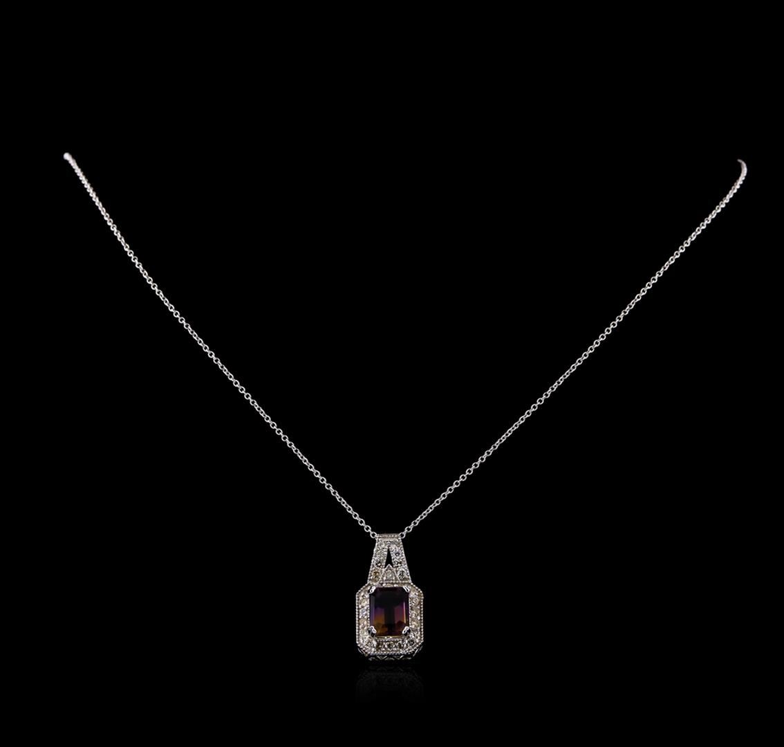 One electronically tested 14KT white gold ladies cast & assembled ametrine and diamond pendant with chain. The featured ametrine is set within a diamond bezel completed by a stylized diamond set hidden bail. The pendant is supported by an eighteen inch length 14KT white gold cable chain, terminating in a lobster claw clasp. Bright polish finish with milgrain detailing. Identified with markings of "K14". Condition is new, good workmanship. Containing: One prong set rectangular step cut natural ametrine quartz, measuring 9.30 x 7.30 x 5.00mm, approximate weight of 2.75ct., clarity is eye clean, type I, medium dark, very slightly grayish, purple color, (GIA P 6/3) to medium dark, slightly brownish, orangy yellow, (GIA oY 6/2), cut is good. Transmitting light with no distortion, transparent. Graded in the setting. Twenty-Seven prong set round brilliant cut diamonds, measuring 1.80 - 1.80 x 1.08mm (depth est.) approximate total weight of 27 Stones = 0.59ct. Graded in the setting. Clarity: SI-1 to SI-2. Color: H - J. Total Weight of Colored Stones 2.75ct. Total Weight of Diamonds 0.59ct. Total Weight of Pendant With Chain 6.08gm. AIG Appraised.