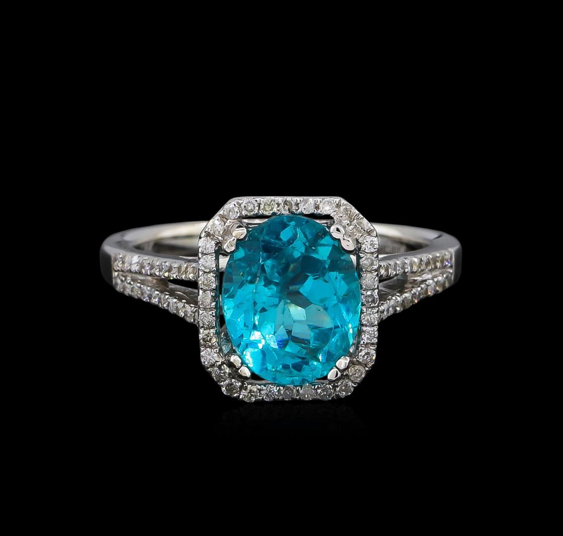 One electronically tested 14KT white gold lady's cast split shank halo ring with a bright polish finish. The featured ladies ring has a shank measuring 2.50 millimeters in width. Trademark is Orianne. Identified with markings of "14K". Condition is new, good workmanship. Containing: One prong set oval modified brilliant cut natural apatite, measuring 9.82 x 7.98 x 5.23mm, approximate weight of 2.75ct., clarity is slightly included, medium, moderately strong, green blue color, (GIA GB 5/4), cut is good. Transmitting light somewhat diffusely, semi-transparent to translucent. Colored gemstones are presumed to have been subjected to commonly used enhancement processes. Graded in the setting. One Hundred Ten prong set round brilliant cut diamonds, measuring 1.10 - 1.00 x 0.66mm (depth est.) approximate total weight of 110 Stones = 0.45ct. Graded in the setting. Clarity: SI-2 to I-1. Color: G - I. Cut Good. Total Weight of Colored Stones 2.75ct. Total Weight of Diamonds 0.45ct. Total Weight of Ring 4.70gm. GAS Appraised at $4,005.00.