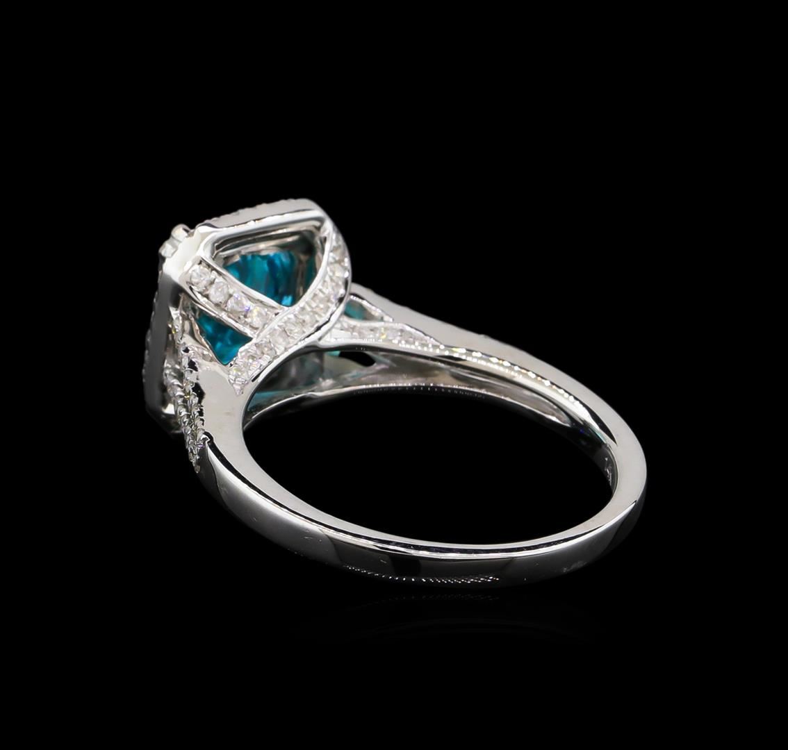 One electronically tested 14KT white gold lady's cast split shank halo ring with a bright polish finish. The featured ladies ring has a shank measuring 2.50 millimeters in width. Trademark is Orianne. Identified with markings of "14K". Condition is new, good workmanship. Containing: One prong set oval modified brilliant cut natural apatite, measuring 9.82 x 7.98 x 5.23mm, approximate weight of 2.75ct., clarity is slightly included, medium, moderately strong, green blue color, (GIA GB 5/4), cut is good. Transmitting light somewhat diffusely, semi-transparent to translucent. Colored gemstones are presumed to have been subjected to commonly used enhancement processes. Graded in the setting. One Hundred Ten prong set round brilliant cut diamonds, measuring 1.10 - 1.00 x 0.66mm (depth est.) approximate total weight of 110 Stones = 0.45ct. Graded in the setting. Clarity: SI-2 to I-1. Color: G - I. Cut Good. Total Weight of Colored Stones 2.75ct. Total Weight of Diamonds 0.45ct. Total Weight of Ring 4.70gm. GAS Appraised at $4,005.00.