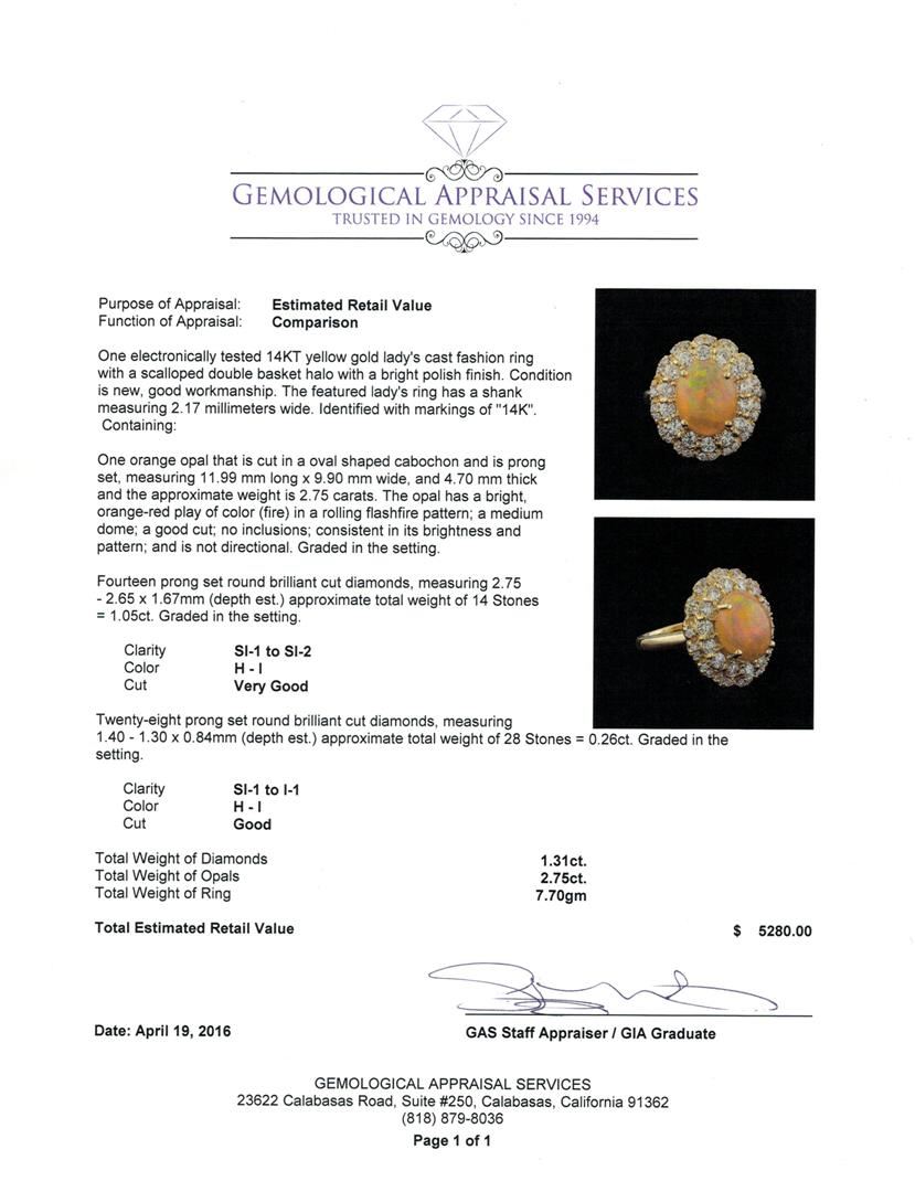 One electronically tested 14KT yellow gold lady's cast fashion ring with a scalloped double basket halo with a bright polish finish. The featured lady's ring has a shank measuring 2.17 millimeters wide. Identified with markings of "14K". Condition is new, good workmanship. Containing: One orange opal that is cut in a oval shaped cabochon and is prong set, measuring 11.99 mm long x 9.90 mm wide, and 4.70 mm thick and the approximate weight is 2.75 carats. The opal has a bright, orange-red play of color (fire) in a rolling flashfire pattern; a medium dome; a good cut; no inclusions; consistent in its brightness and pattern; and is not directional. Graded in the setting. Fourteen prong set round brilliant cut diamonds, measuring 2.75 - 2.65 x 1.67mm (depth est.) approximate total weight of 14 Stones = 1.05ct. Graded in the setting. Clarity: SI-1 to SI-2. Color: H - I. Cut Very Good Twenty-Eight prong set round brilliant cut diamonds, measuring 1.40 - 1.30 x 0.84mm (depth est.) approximate total weight of 28 Stones = 0.26ct. Graded in the setting. Clarity: SI-1 to I-1. Color: H - I. Cut Good. Total Weight of Diamonds 1.31ct. Total Weight of Opals 2.75ct. Total Weight of Ring 7.70gm. GAS Appraised at $5,280.00.