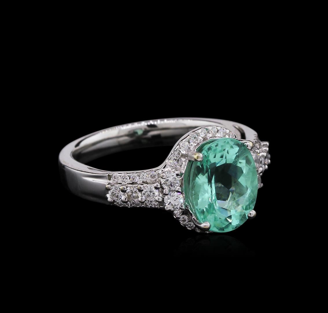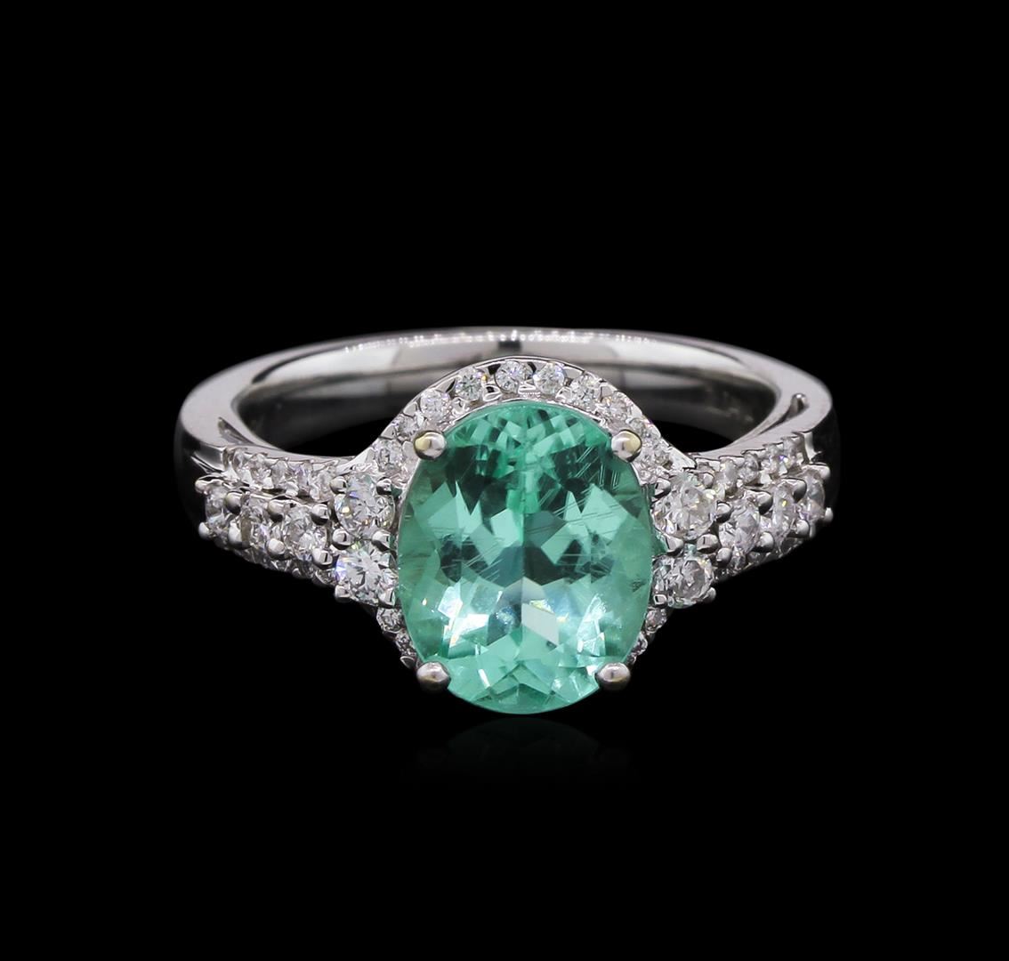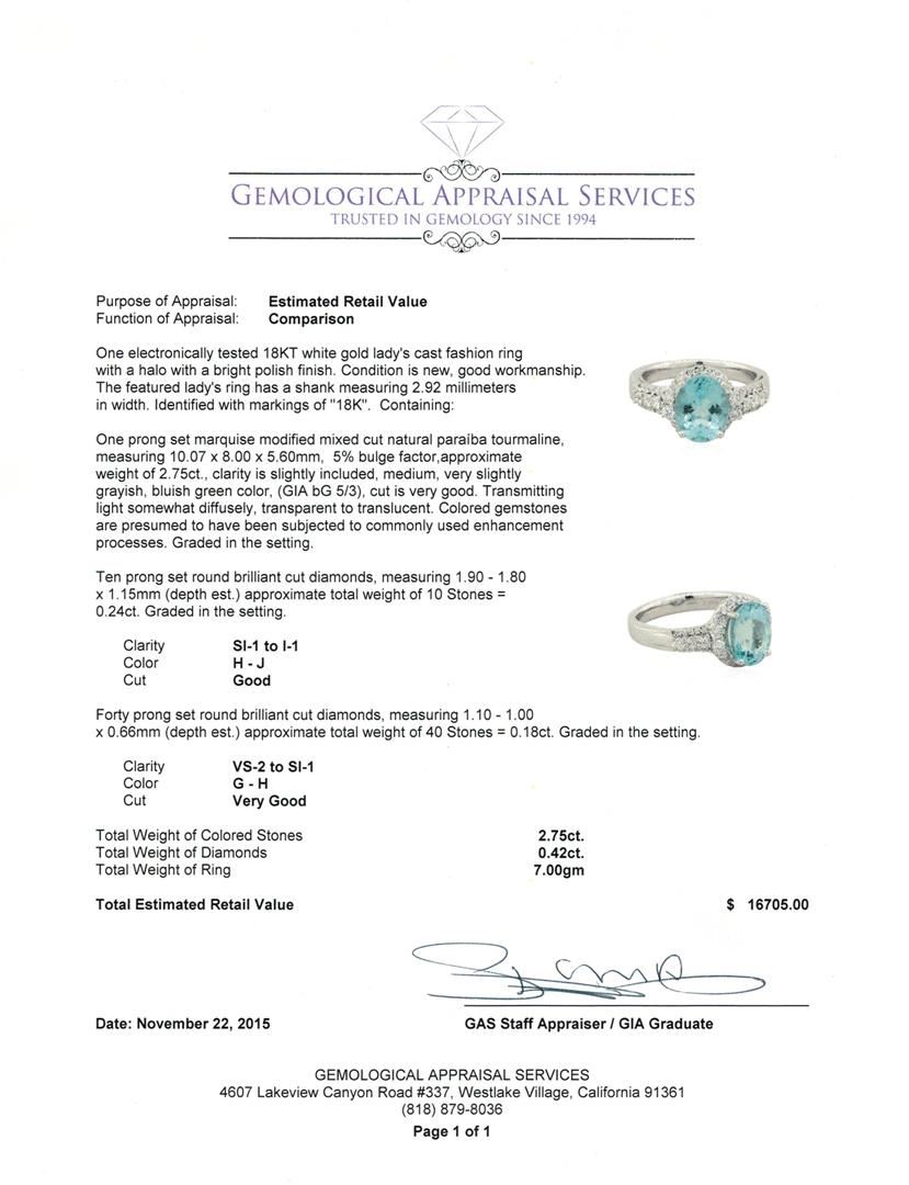 One electronically tested 18KT white gold lady's cast fashion ring with a halo with a bright polish finish. The featured lady's ring has a shank measuring 2.92 millimeters in width. Identified with markings of "18K". Condition is new, good workmanship. Containing: One prong set marquise modified mixed cut natural Paraiba tourmaline, measuring 10.07 x 8.00 x 5.60mm, 5%. bulge factor, approximate weight of 2.75ct., clarity is slightly included, medium, very slightly grayish, bluish green color, (GIA bG 5/3), cut is very good. Transmitting light somewhat diffusely, transparent to translucent. Colored gemstones are presumed to have been subjected to commonly used enhancement processes. Graded in the setting. Ten prong set round brilliant cut diamonds, measuring 1.90 - 1.80 x 1.15mm (depth est.) approximate total weight of 10 Stones = 0.24ct. Graded in the setting. Clarity: SI-1 to I-1. Color: H - Good Forty prong set round brilliant cut diamonds, measuring 1.10 - 1.00 x 0.66mm (depth est.) approximate total weight of 40 Stones = 0.18ct. Graded in the setting. Clarity: VS-2 to SI-1. Color: G - Very Good. Total Weight of Colored Stones 2.75ct. Total Weight of Diamonds 0.42ct. Total Weight of Ring 7.00gm. GAS Appraised at $16,705.00.