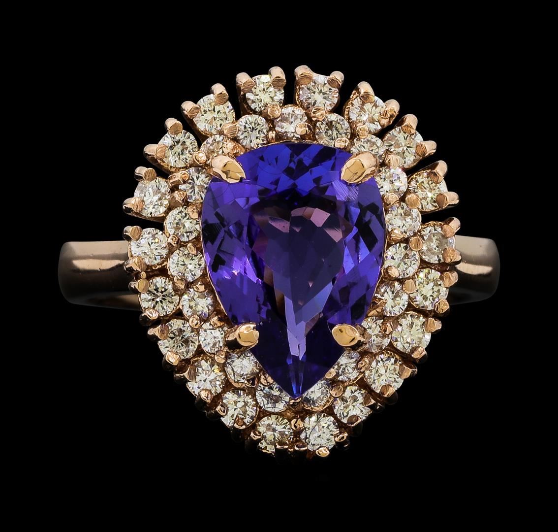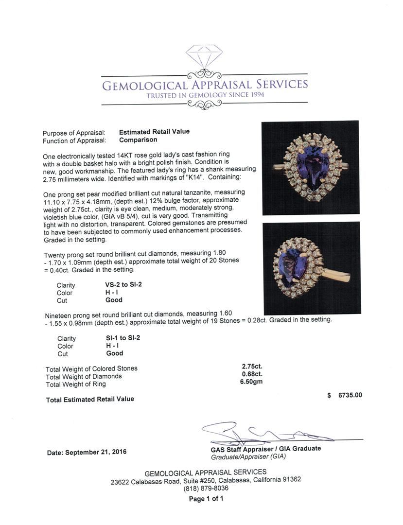 One electronically tested 14KT rose gold lady's cast fashion ring with a double basket halo with a bright polish finish. The featured lady's ring has a shank measuring 2.75 millimeters wide. Identified with markings of 'K14'. Condition is new, good workmanship. Containing: One prong set pear modified brilliant cut natural tanzanite, measuring 11.10 x 7.75 x 4.18mm, (depth est.) 12%. bulge factor, approximate weight of 2.75ct., clarity is eye clean, medium, moderately strong, violetish blue color, (GIA vB 5/4), cut is very good. Transmitting light with no distortion, transparent. Colored gemstones are presumed to have been subjected to commonly used enhancement processes. Graded in the setting. Twenty prong set round brilliant cut diamonds, measuring 1.80 - 1.70 x 1.09mm (depth est.) approximate total weight of 20 Stones = 0.40ct. Graded in the setting. Clarity VS-2 to SI-2. Color: H - I Cut Good Nineteen prong set round brilliant cut diamonds, measuring 1.60 - 1.55 x 0.98mm (depth est.) approximate total weight of 19 Stones = 0.28ct. Graded in the setting. Clarity SI-1 to SI-2. Color: H - I Cut Good. Total Weight of Colored Stones 2.75ct.. Total Weight of Diamonds 0.68ct.. Total Weight of Ring 6.50gm. GAS Appraised at $6,735.00.