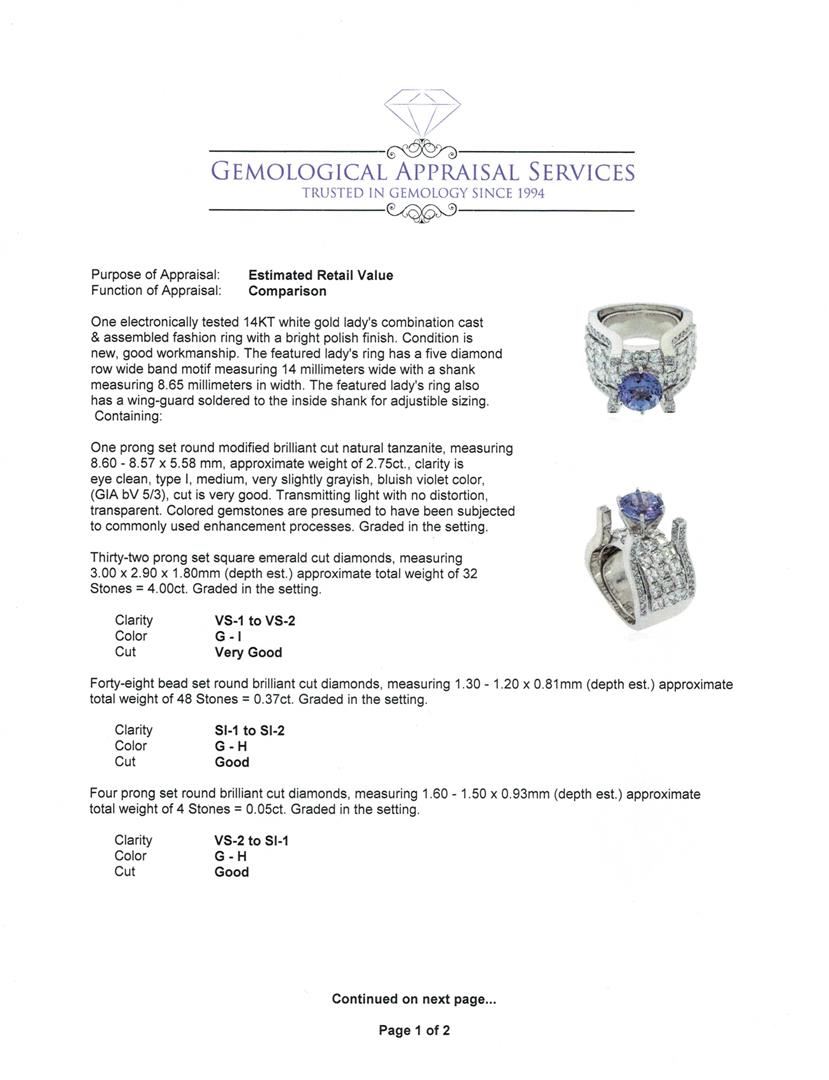 One electronically tested 14KT white gold lady's combination cast & assembled fashion ring with a bright polish finish. The featured lady's ring has a five diamond row wide band motif measuring 14 millimeters wide with a shank measuring 8.65 millimeters in width. The featured lady's ring also has a wing-guard soldered to the inside shank for adjustable sizing. Condition is new, good workmanship. Containing: One prong set round modified brilliant cut natural tanzanite, measuring 8.60 - 8.57 x 5.58 mm, approximate weight of 2.75ct., clarity is eye clean, type I, medium, very slightly grayish, bluish violet color, (GIA bV 5/3), cut is very good. Transmitting light with no distortion, transparent. Colored gemstones are presumed to have been subjected to commonly used enhancement processes. Graded in the setting. Thirty-Two prong set square emerald cut diamonds, measuring 3.00 x 2.90 x 1.80mm (depth est.) approximate total weight of 32 Stones = 4.00ct. Graded in the setting. Clarity: VS-1 to VS-2. Color: G - I. Cut Very Good Forty-Eight bead set round brilliant cut diamonds, measuring 1.30 - 1.20 x 0.81mm (depth est.) approximate total weight of 48 Stones = 0.37ct. Graded in the setting. Clarity: SI-1 to SI-2. Color: G - Good Four prong set round brilliant cut diamonds, measuring 1.60 - 1.50 x 0.93mm (depth est.) approximate total weight of 4 Stones = 0.05ct. Graded in the setting. Clarity: VS-2 to SI-1. Color: G - Good. Total Weight of Colored Stones 2.75ct. Total Weight of Diamonds 4.42ct. Total Weight of Ring 19.80gm. GAS Appraised at $14,550.00.
