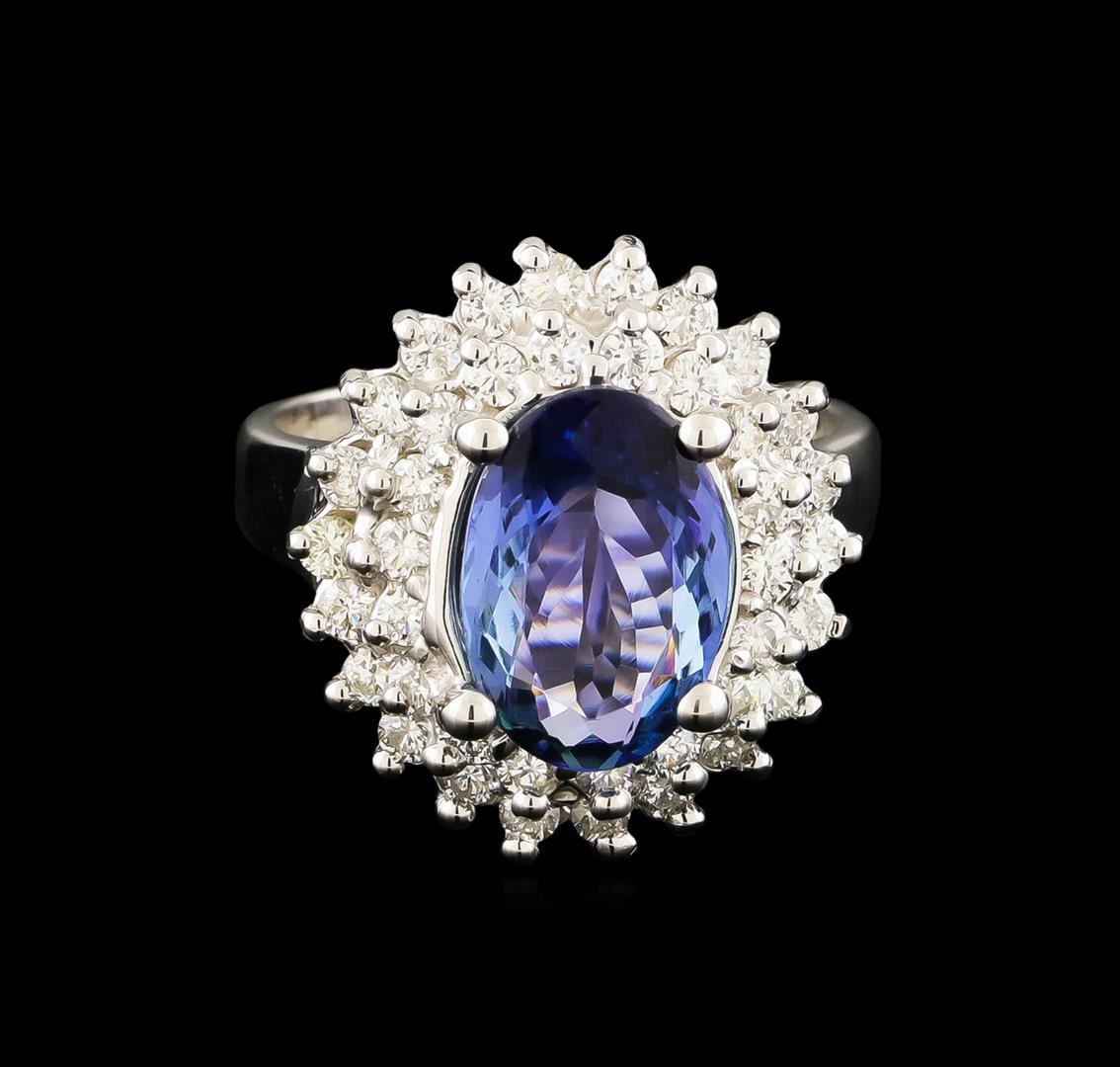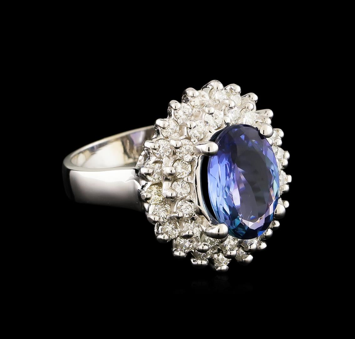 One electronically tested 14KT white gold lady's cast fashion ring with a double basket halo with a bright polish finish. The featured lady's ring has a shank measuring 3.44 millimeters wide. Identified with markings of "14K". Condition is new, good workmanship. Containing: One prong set oval modified brilliant cut natural tanzanite, measuring 11.15 x 7.68 x 4.30mm, 7%. bulge factor, approximate weight of 2.75ct., clarity is eye clean, medium light, moderately strong, bluish violet color, (GIA bV 4/4), cut is good. Transmitting light with no distortion, transparent. Colored gemstones are presumed to have been subjected to commonly used enhancement processes. Graded in the setting. Forty prong set round brilliant cut diamonds, measuring 1.90 - 1.80 x 1.15mm (depth est.) approximate total weight of 40 Stones = 0.96ct. Graded in the setting. Clarity: SI-1 to SI-2. Color: G - I. Cut Good. Total Weight of Colored Stones 2.75ct. Total Weight of Diamonds 0.96ct. Total Weight of Ring 6.80gm. GAS Appraised at $6,825.00.