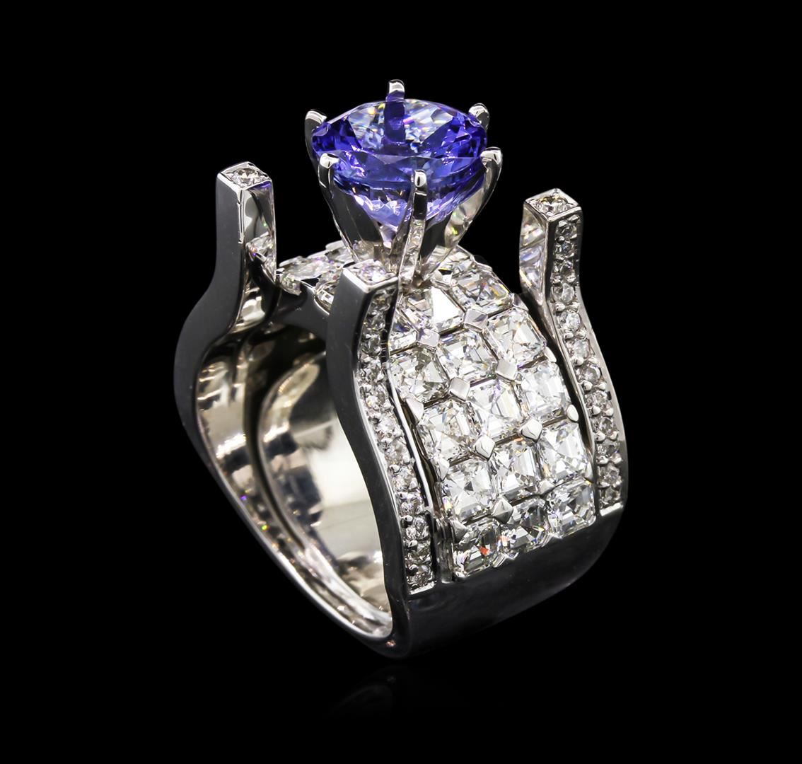 One electronically tested 14KT white gold lady's combination cast & assembled fashion ring with a bright polish finish. The featured lady's ring has a five diamond row wide band motif measuring 14 millimeters wide with a shank measuring 8.65 millimeters in width. The featured lady's ring also has a wing-guard soldered to the inside shank for adjustable sizing. Condition is new, good workmanship. Containing: One prong set round modified brilliant cut natural tanzanite, measuring 8.60 - 8.57 x 5.58 mm, approximate weight of 2.75ct., clarity is eye clean, type I, medium, very slightly grayish, bluish violet color, (GIA bV 5/3), cut is very good. Transmitting light with no distortion, transparent. Colored gemstones are presumed to have been subjected to commonly used enhancement processes. Graded in the setting. Thirty-Two prong set square emerald cut diamonds, measuring 3.00 x 2.90 x 1.80mm (depth est.) approximate total weight of 32 Stones = 4.00ct. Graded in the setting. Clarity: VS-1 to VS-2. Color: G - I. Cut Very Good Forty-Eight bead set round brilliant cut diamonds, measuring 1.30 - 1.20 x 0.81mm (depth est.) approximate total weight of 48 Stones = 0.37ct. Graded in the setting. Clarity: SI-1 to SI-2. Color: G - Good Four prong set round brilliant cut diamonds, measuring 1.60 - 1.50 x 0.93mm (depth est.) approximate total weight of 4 Stones = 0.05ct. Graded in the setting. Clarity: VS-2 to SI-1. Color: G - Good. Total Weight of Colored Stones 2.75ct. Total Weight of Diamonds 4.42ct. Total Weight of Ring 19.80gm. GAS Appraised at $14,550.00.