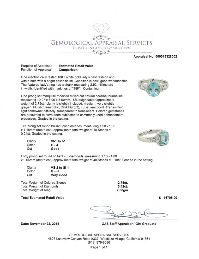 One electronically tested 18KT white gold lady's cast fashion ring with a halo with a bright polish finish. The featured lady's ring has a shank measuring 2.92 millimeters in width. Identified with markings of "18K". Condition is new, good workmanship. Containing: One prong set marquise modified mixed cut natural Paraiba tourmaline, measuring 10.07 x 8.00 x 5.60mm, 5%. bulge factor, approximate weight of 2.75ct., clarity is slightly included, medium, very slightly grayish, bluish green color, (GIA bG 5/3), cut is very good. Transmitting light somewhat diffusely, transparent to translucent. Colored gemstones are presumed to have been subjected to commonly used enhancement processes. Graded in the setting. Ten prong set round brilliant cut diamonds, measuring 1.90 - 1.80 x 1.15mm (depth est.) approximate total weight of 10 Stones = 0.24ct. Graded in the setting. Clarity: SI-1 to I-1. Color: H - Good Forty prong set round brilliant cut diamonds, measuring 1.10 - 1.00 x 0.66mm (depth est.) approximate total weight of 40 Stones = 0.18ct. Graded in the setting. Clarity: VS-2 to SI-1. Color: G - Very Good. Total Weight of Colored Stones 2.75ct. Total Weight of Diamonds 0.42ct. Total Weight of Ring 7.00gm. GAS Appraised at $16,705.00.