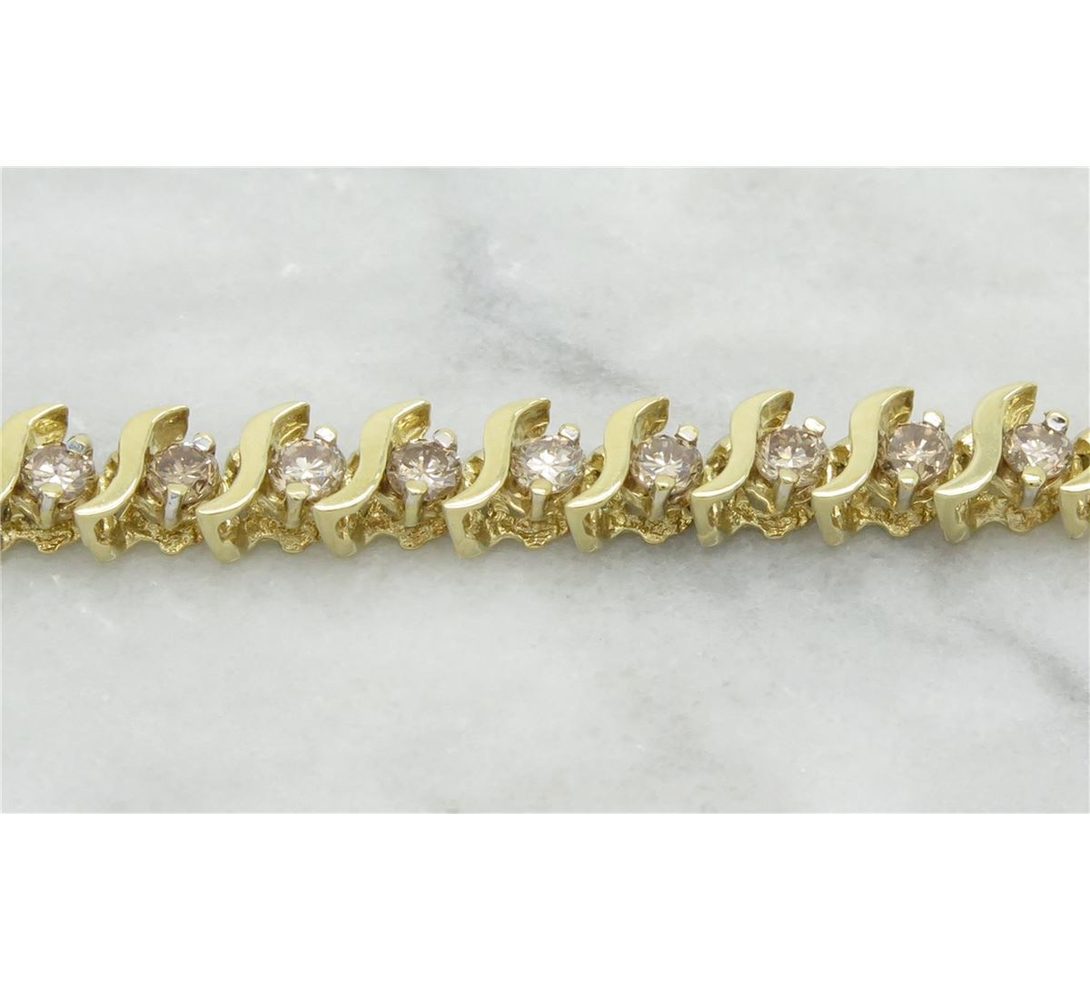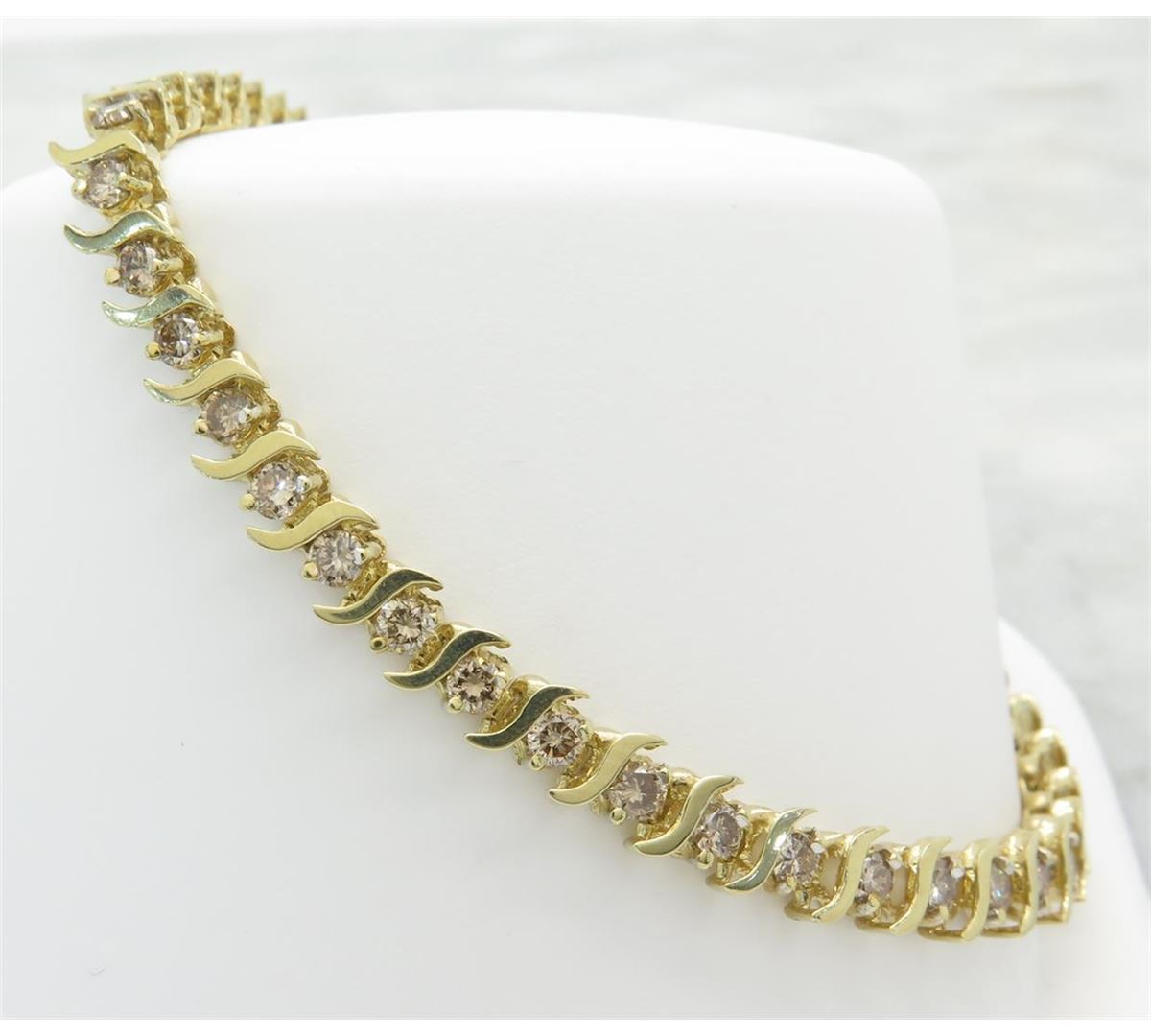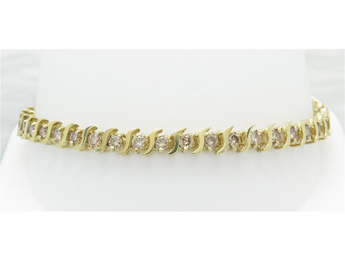 One tested 10K yellow gold diamond bracelet. Containing: 44 Round Brilliant Cut Diamonds. Clarity: SI, Color: Champagne. Approximate total diamond weight: 2.75CTW. Diamonds are graded in the mounting, unless otherwise stated. Weight: 9.1 grams, Size: 7.5" long.