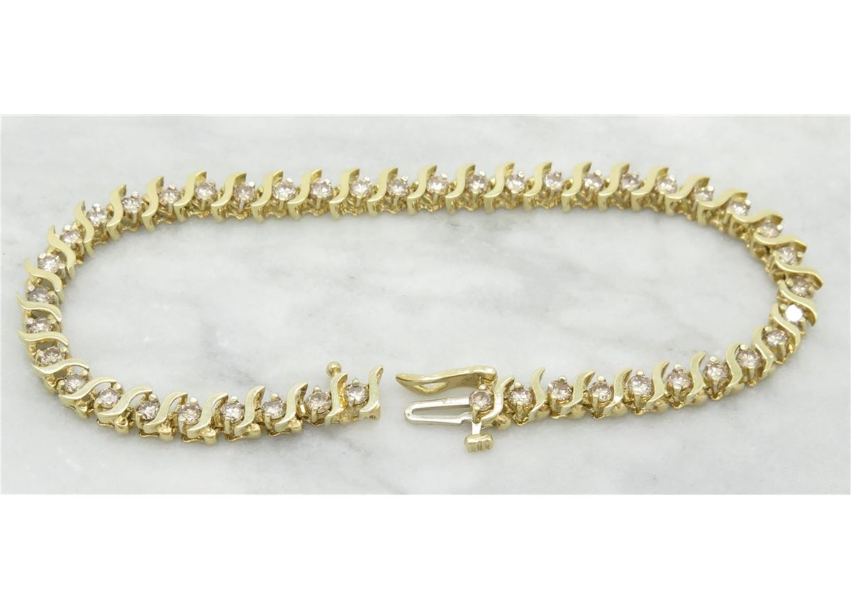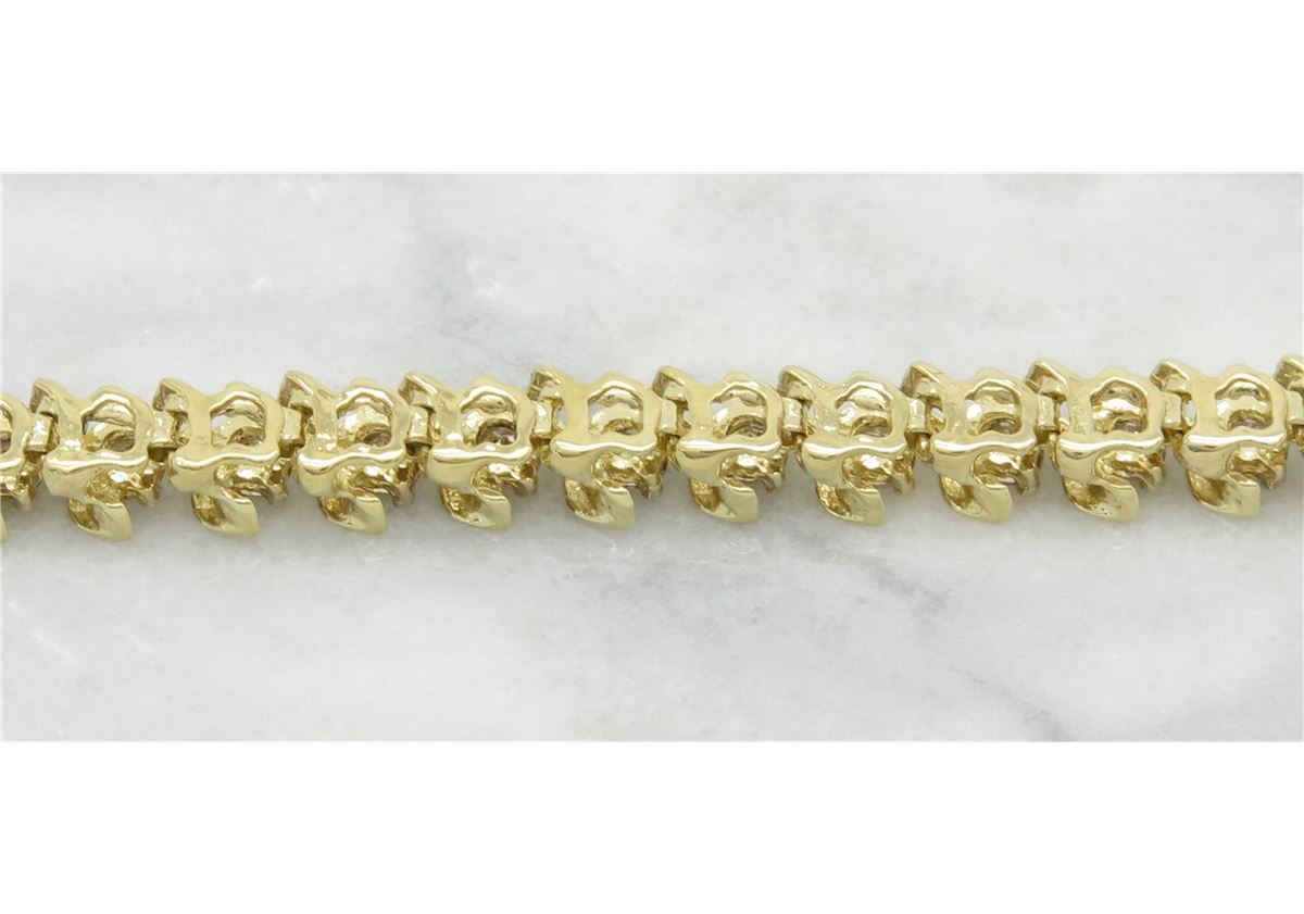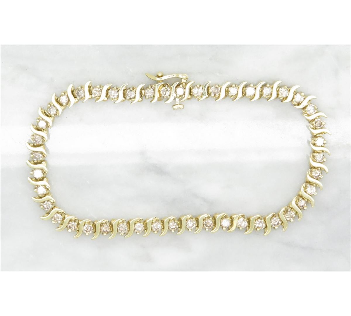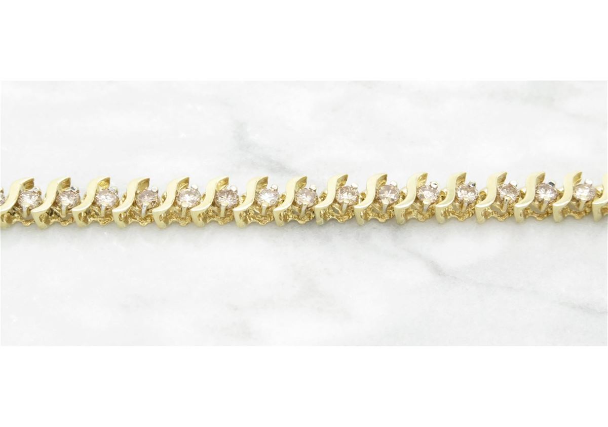 One tested 10K yellow gold diamond bracelet. Containing: 44 Round Brilliant Cut Diamonds. Clarity: SI, Color: Champagne. Approximate total diamond weight: 2.75CTW. Diamonds are graded in the mounting, unless otherwise stated. Weight: 9.1 grams, Size: 7.5" long.