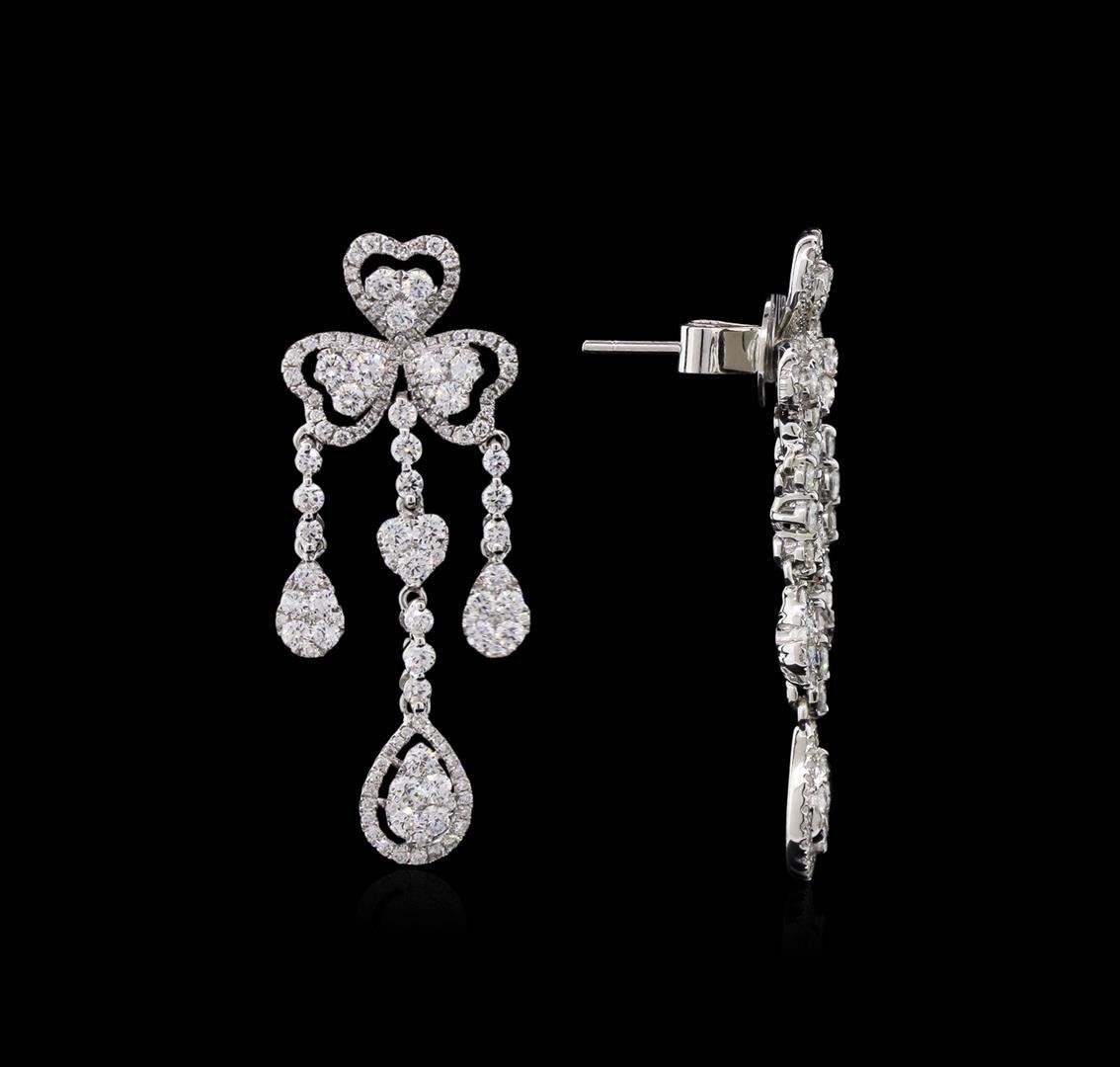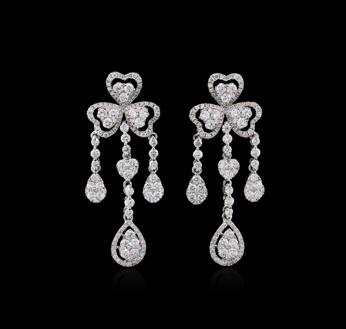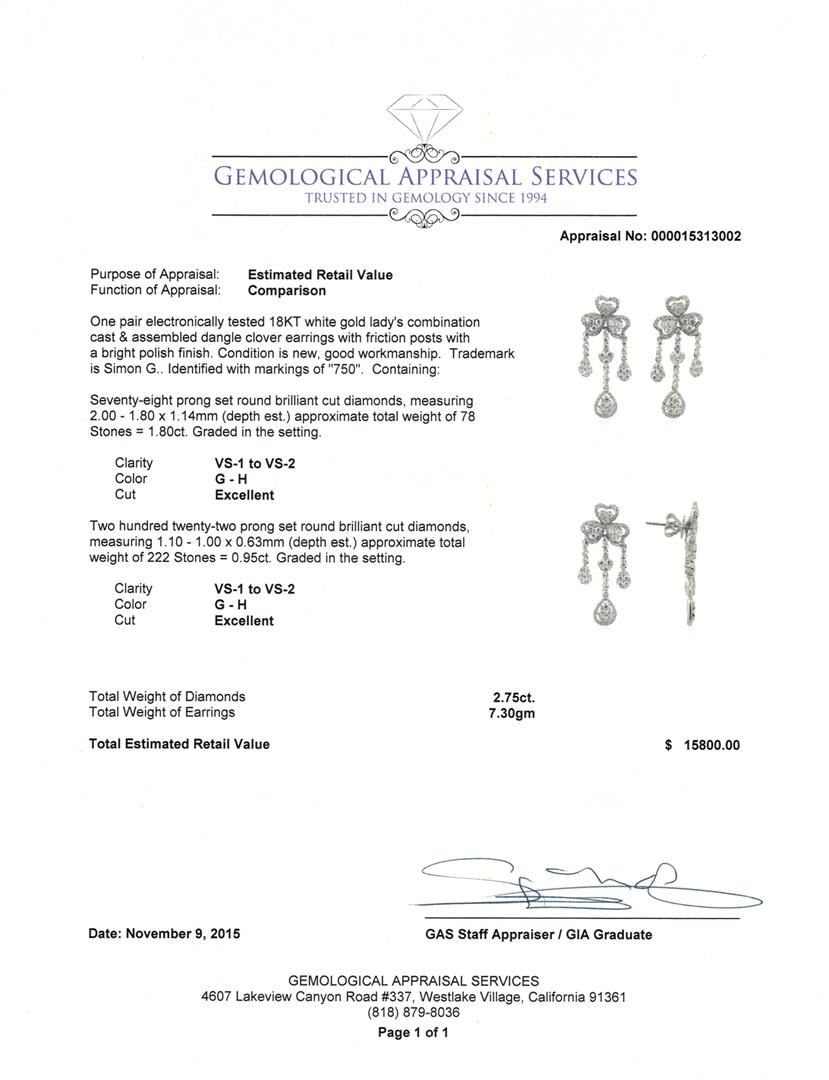 One pair electronically tested 18KT white gold lady's combination cast & assembled dangle clover earrings with friction posts with a bright polish finish. Trademark is Simon G. Identified with markings of "750". Condition is new, good workmanship. Containing: Seventy-Eight prong set round brilliant cut diamonds, measuring 2.00 - 1.80 x 1.14mm (depth est.) approximate total weight of 78 Stones = 1.80ct. Graded in the setting. Clarity: VS-1 to VS-2. Color: G - H. Cut Excellent Two Hundred Twenty-Two prong set round brilliant cut diamonds, measuring 1.10 - 1.00 x 0.63mm (depth est.) approximate total weight of 222 Stones = 0.95ct. Graded in the setting. Clarity: VS-1 to VS-2. Color: G - Excellent. Total Weight of Diamonds 2.75ct. Total Weight of Earrings 7.30gm. GAS Appraised at $15,800.00.