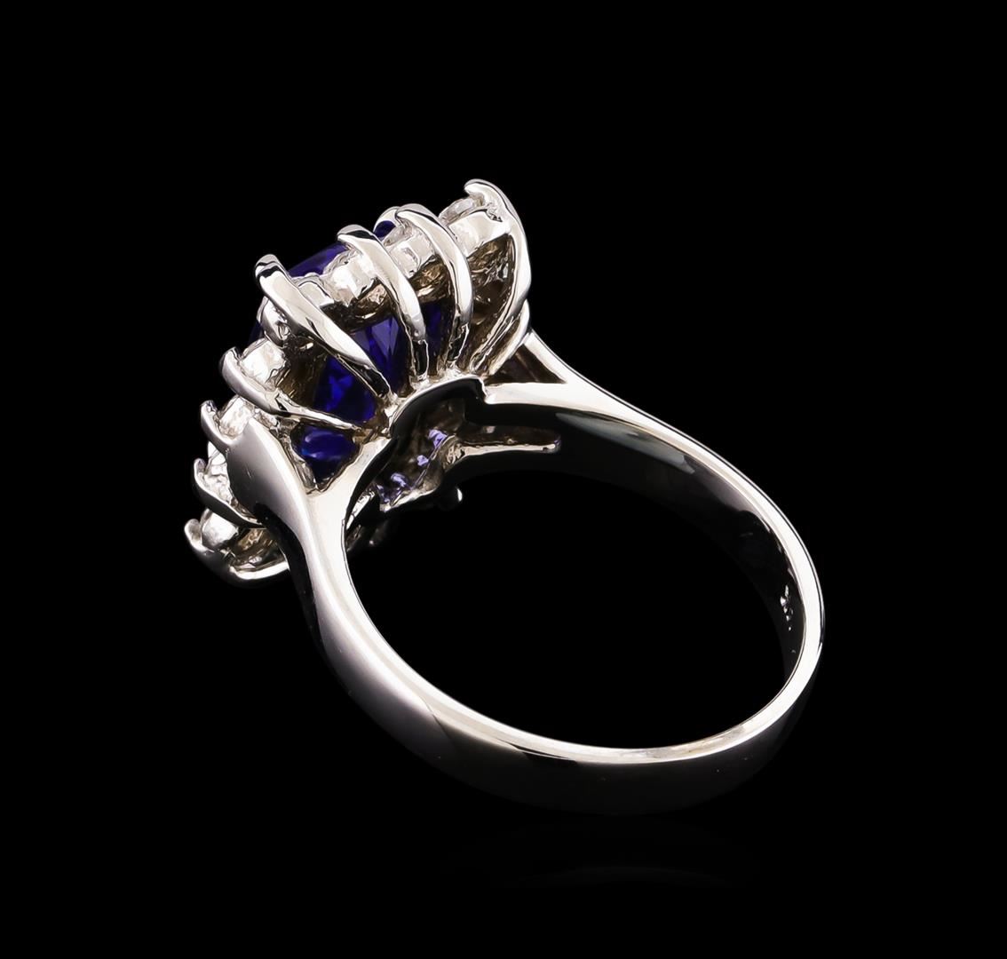 One electronically tested 14KT white gold lady's cast fashion ring with a basket halo with a bright polish finish. The featured lady's ring has a shank measuring 2.90 millimeters wide. Identified with markings of "14K". Condition is new, good workmanship. Containing: One prong set rectangular cushion modified brilliant cut natural tanzanite, measuring 10.05 x 6.98 x 4.77mm, 5%. bulge factor, approximate weight of 2.76ct., clarity is eye clean, medium dark, moderately strong, violetish blue color, (GIA vB 6/4), cut is very good. Transmitting light with no distortion, transparent. Colored gemstones are presumed to have been subjected to commonly used enhancement processes. Graded in the setting. Fourteen prong set round brilliant cut diamonds, measuring 2.50 - 2.40 x 1.52mm (depth est.) approximate total weight of 14 Stones = 0.80ct. Graded in the setting. Clarity: SI-1 to SI-2. Color: H - I. Cut Good. Total Weight of Colored Stones 2.76ct. Total Weight of Diamonds 0.80ct. Total Weight of Ring 6.40gm. GAS Appraised at $7,105.00.