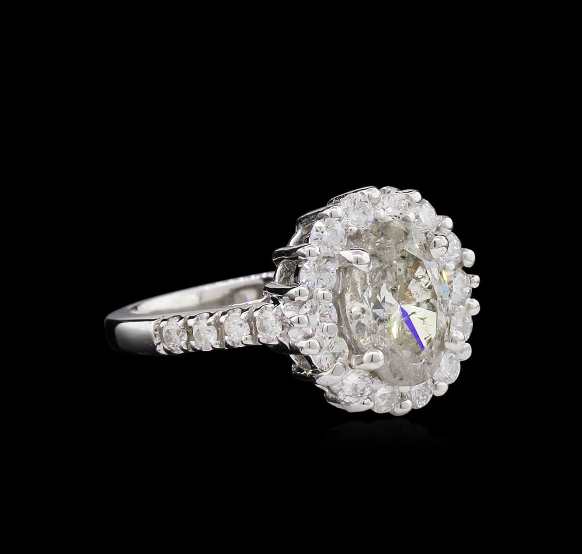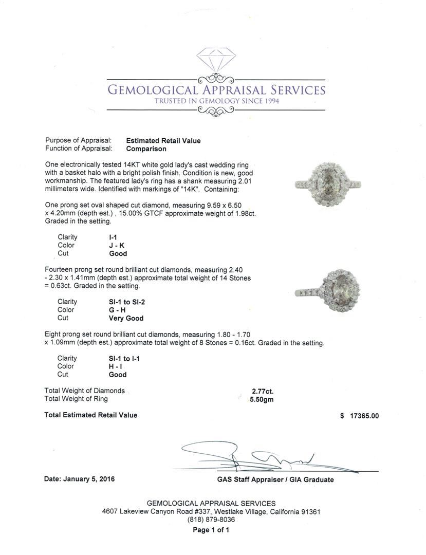 One electronically tested 14KT white gold lady's cast wedding ring with a basket halo with a bright polish finish. The featured lady's ring has a shank measuring 2.01 millimeters wide. Identified with markings of "14K". Condition is new, good workmanship. Containing: One prong set oval shaped cut diamond, measuring 9.59 x 6.50 x 4.20mm (depth est.) , 15.00.%. GTCF approximate weight of 1.98ct. Graded in the setting. Clarity: I-1. Color: J - K. Cut Good Fourteen prong set round brilliant cut diamonds, measuring 2.40 - 2.30 x 1.41mm (depth est.) approximate total weight of 14 Stones = 0.63ct. Graded in the setting. Clarity: SI-1 to SI-2. Color: G - Very Good Eight prong set round brilliant cut diamonds, measuring 1.80 - 1.70 x 1.09mm (depth est.) approximate total weight of 8 Stones = 0.16ct. Graded in the setting. Clarity: SI-1 to I-1. Color: H - I. Cut Good. Total Weight of Diamonds 2.77ct. Total Weight of Ring 5.50gm. GAS Appraised at $17,365.00.