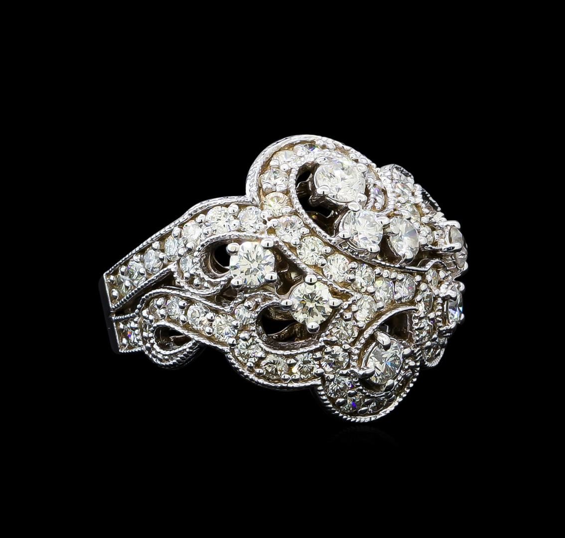 One electronically tested 14KT white gold lady's cast fashion ring with a swirl wide dome with a bright polish with milgrain detailing finish. The featured lady's ring has a shank measuring 3.60 millimeters in width. Identified with markings of "14K". Condition is new, good workmanship. Containing: One prong set round brilliant cut diamond, measuring 3.60 - 3.50 x 2.20mm (depth est.) approximate weight of 0.18ct. Graded in the setting. Clarity: I-1. Color: Good Seven prong set round brilliant cut diamonds, measuring 3.30 - 3.00 x 1.96mm (depth est.) approximate total weight of 7 Stones = 0.81ct. Graded in the setting. Clarity: VS-2 to SI-2. Color: H - I. Cut Good Fifty prong set round brilliant cut diamonds, measuring 2.10 - 2.00 x 1.27mm (depth est.) approximate total weight of 50 Stones = 1.60ct. Graded in the setting. Clarity: SI-1 to SI-2. Color: H - I. Cut Good Eleven prong set round brilliant cut diamonds, measuring 1.60 - 1.50 x 0.96mm (depth est.) approximate total weight of 11 Stones = 0.18ct. Graded in the setting. Clarity: SI-1 to SI-2. Color: H - I. Cut Good. Total Weight of Diamonds 2.77ct. Total Weight of Ring 11.20gm. GAS Appraised at $6,970.00.