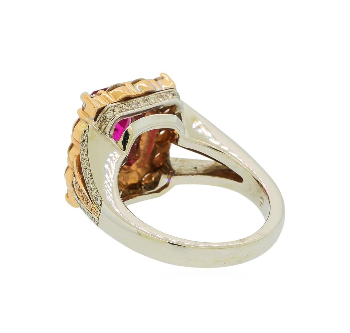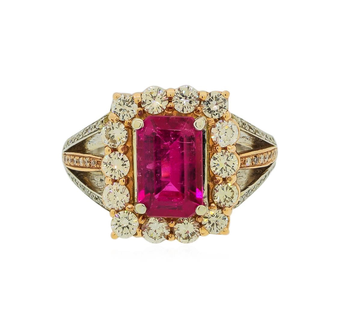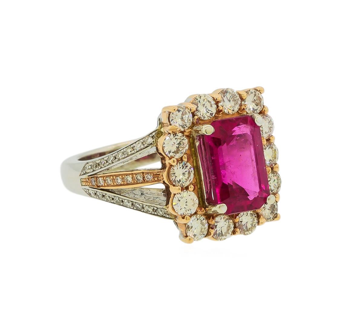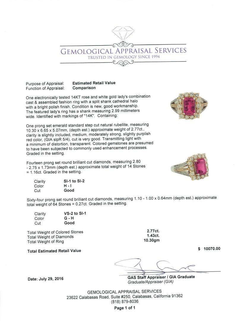 One electronically tested 14KT rose and white gold lady's combination cast & assembled fashion ring with a split shank cathedral halo with a bright polish finish. The featured lady's ring has a shank measuring 2.99 millimeters wide. Identified with markings of '14K'. Condition is new, good workmanship. Containing: One prong set emerald standard step cut natural rubellite, measuring 10.30 x 6.65 x 5.07mm, (depth est.) approximate weight of 2.77ct., clarity is slightly included, medium, moderately strong, slightly purplish red color, (GIA slpR 5/4), cut is very good. Transmitting light with a minimum of distortion, transparent. Colored gemstones are presumed to have been subjected to commonly used enhancement processes. Graded in the setting. Fourteen prong set round brilliant cut diamonds, measuring 2.80 - 2.75 x 1.73mm (depth est.) approximate total weight of 14 Stones = 1.16ct. Graded in the setting. Clarity SI-1 to SI-2. Color: H - I Cut Good Sixty-Four prong set round brilliant cut diamonds, measuring 1.10 - 1.00 x 0.64mm (depth est.) approximate total weight of 64 Stones = 0.27ct. Graded in the setting. Clarity VS-2 to SI-1. Color: G - H Cut Good. Total Weight of Colored Stones 2.77ct.. Total Weight of Diamonds 1.43ct.. Total Weight of Ring 10.30gm. GAS Appraised at $10,070.00.