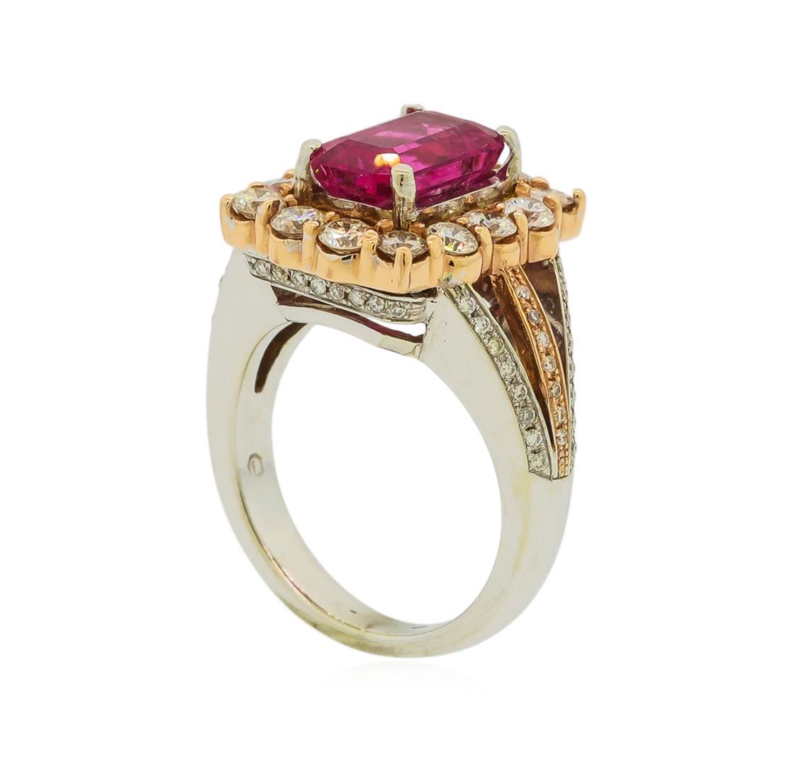 One electronically tested 14KT rose and white gold lady's combination cast & assembled fashion ring with a split shank cathedral halo with a bright polish finish. The featured lady's ring has a shank measuring 2.99 millimeters wide. Identified with markings of '14K'. Condition is new, good workmanship. Containing: One prong set emerald standard step cut natural rubellite, measuring 10.30 x 6.65 x 5.07mm, (depth est.) approximate weight of 2.77ct., clarity is slightly included, medium, moderately strong, slightly purplish red color, (GIA slpR 5/4), cut is very good. Transmitting light with a minimum of distortion, transparent. Colored gemstones are presumed to have been subjected to commonly used enhancement processes. Graded in the setting. Fourteen prong set round brilliant cut diamonds, measuring 2.80 - 2.75 x 1.73mm (depth est.) approximate total weight of 14 Stones = 1.16ct. Graded in the setting. Clarity SI-1 to SI-2. Color: H - I Cut Good Sixty-Four prong set round brilliant cut diamonds, measuring 1.10 - 1.00 x 0.64mm (depth est.) approximate total weight of 64 Stones = 0.27ct. Graded in the setting. Clarity VS-2 to SI-1. Color: G - H Cut Good. Total Weight of Colored Stones 2.77ct.. Total Weight of Diamonds 1.43ct.. Total Weight of Ring 10.30gm. GAS Appraised at $10,070.00.