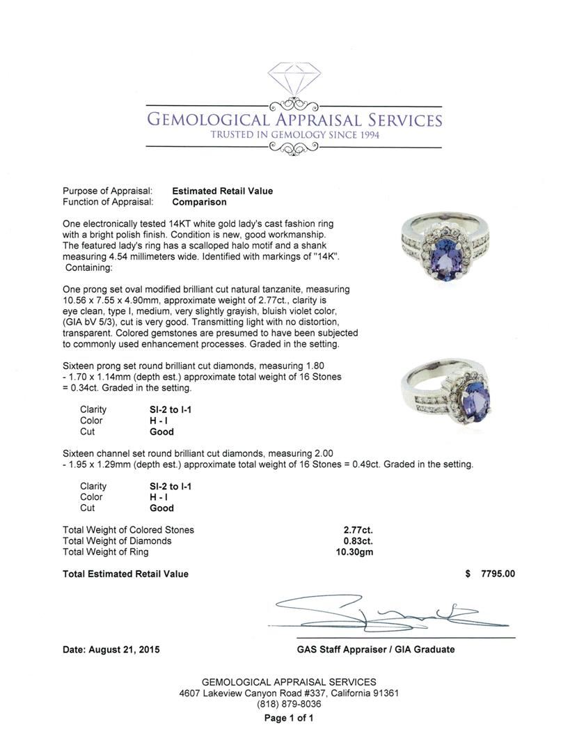 One electronically tested 14KT white gold lady's cast fashion ring with a bright polish finish. The featured lady's ring has a scalloped halo motif and a shank measuring 4.54 millimeters wide. Identified with markings of "14K". Condition is new, good workmanship. Containing: One prong set oval modified brilliant cut natural tanzanite, measuring 10.56 x 7.55 x 4.90mm, approximate weight of 2.77ct., clarity is eye clean, type I, medium, very slightly grayish, bluish violet color, (GIA bV 5/3), cut is very good. Transmitting light with no distortion, transparent. Colored gemstones are presumed to have been subjected to commonly used enhancement processes. Graded in the setting. Sixteen prong set round brilliant cut diamonds, measuring 1.80 - 1.70 x 1.14mm (depth est.) approximate total weight of 16 Stones = 0.34ct. Graded in the setting. Clarity: SI-2 to I-1. Color: H - I. Cut Good Sixteen channel set round brilliant cut diamonds, measuring 2.00 - 1.95 x 1.29mm (depth est.) approximate total weight of 16 Stones = 0.49ct. Graded in the setting. Clarity: SI-2 to I-1. Color: H - I. Cut Good. Total Weight of Colored Stones 2.77ct. Total Weight of Diamonds 0.83ct. Total Weight of Ring 10.30gm. GAS Appraised.