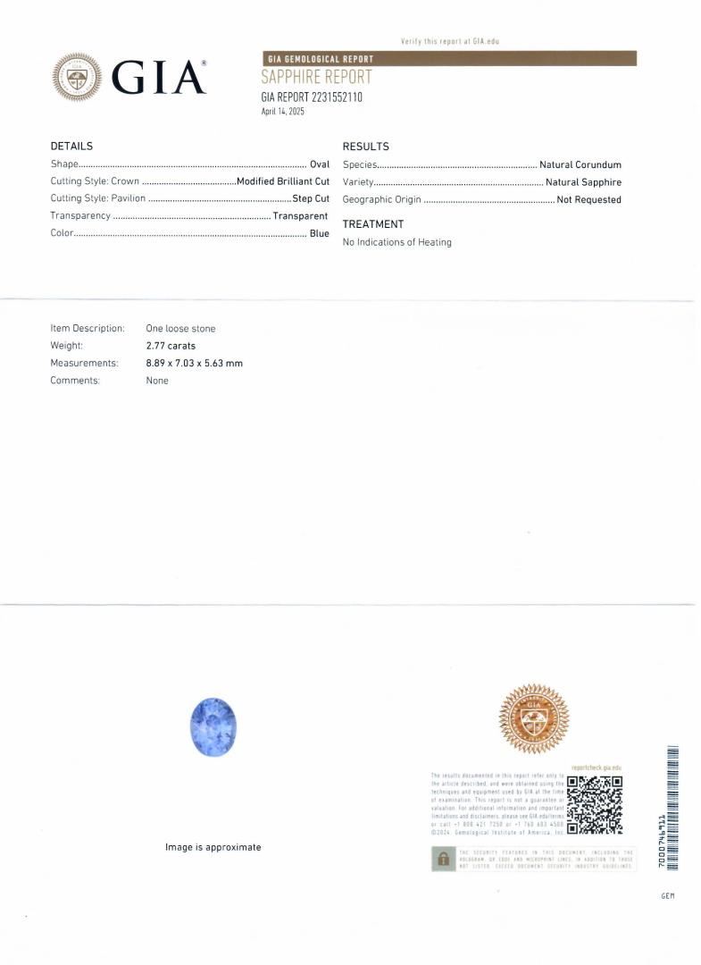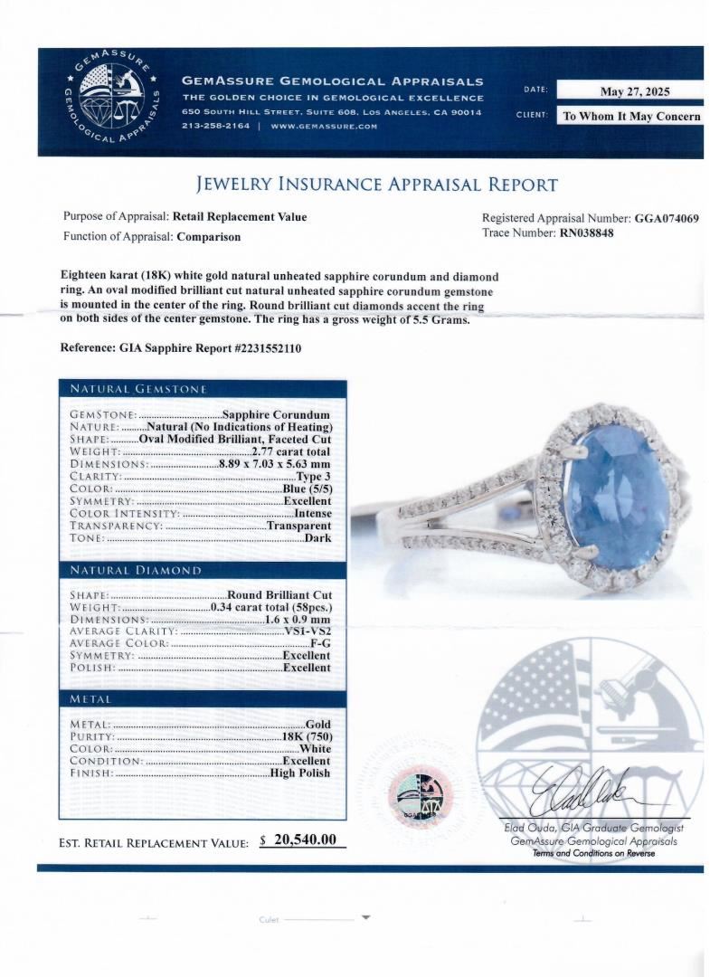 Eighteen karat (18K) white gold natural unheated sapphire corundum and diamond ring. An oval modified brilliant cut natural unheated sapphire corundum gemstone is mounted in the center of the ring. Round brilliant cut diamonds accent the ring on both sides of the center gemstone. The ring has a gross weight of 5.5 Grams. Reference: GIA Sapphire Report 2231552110 #NATURAL GEMSTONE# GEMSTONE: Sapphire Corundum; NATURE: Natural (No Indications of Heating); SHAPE: Oval Modified Brilliant, Faceted Cut; WEIGHT: 2.77 carat total; DIMENSIONS: 8.89 x 7.03 x 5.63mm; CLARITY: Type 3; COLOR: Blue (5/5); SYMMETRY: Excellent; COLOR INTENSITY: Intense; TRANSPARENCY: Transparent; TONE: Dark #NATURAL DIAMOND# SHAPE: Round Brilliant Cut; WEIGHT: 0.34 carat total (58pcs.); DIMENSIONS: 1.6 x 0.9mm; AVERAGE CLARITY: VS1-VS2; AVERAGE COLOR: F-G; SYMMETRY: Excellent; POLISH: Excellent #METAL# METAL: Gold; PURITY: 18K (750); COLOR: White; CONDITION: Excellent; FINISH: High Polish #Size: 6 3/4
