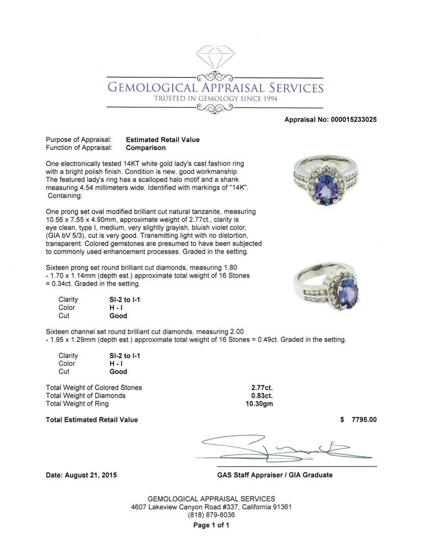 One electronically tested 14KT white gold lady's cast fashion ring with a bright polish finish. The featured lady's ring has a scalloped halo motif and a shank measuring 4.54 millimeters wide. Identified with markings of "14K". Condition is new, good workmanship. Containing: One prong set oval modified brilliant cut natural tanzanite, measuring 10.56 x 7.55 x 4.90mm, approximate weight of 2.77ct., clarity is eye clean, type I, medium, very slightly grayish, bluish violet color, (GIA bV 5/3), cut is very good. Transmitting light with no distortion, transparent. Colored gemstones are presumed to have been subjected to commonly used enhancement processes. Graded in the setting. Sixteen prong set round brilliant cut diamonds, measuring 1.80 - 1.70 x 1.14mm (depth est.) approximate total weight of 16 Stones = 0.34ct. Graded in the setting. Clarity: SI-2 to I-1. Color: H - I. Cut Good Sixteen channel set round brilliant cut diamonds, measuring 2.00 - 1.95 x 1.29mm (depth est.) approximate total weight of 16 Stones = 0.49ct. Graded in the setting. Clarity: SI-2 to I-1. Color: H - I. Cut Good. Total Weight of Colored Stones 2.77ct. Total Weight of Diamonds 0.83ct. Total Weight of Ring 10.30gm. GAS Appraised at $7,795.00.
