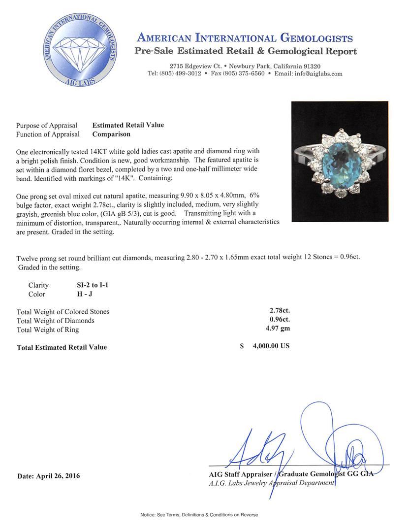 One electronically tested 14KT white gold ladies cast apatite and diamond ring with a bright polish finish. The featured apatite is set within a diamond floret bezel, completed by a two and one-half millimeter wide band. Identified with markings of "14K". Condition is new, good workmanship. Containing: One prong set oval mixed cut natural apatite, measuring 9.90 x 8.05 x 4.80mm, 6%. bulge factor, exact weight 2.78ct., clarity is slightly included, medium, very slightly grayish, greenish blue color, (GIA gB 5/3), cut is good. Transmitting light with a minimum of distortion, transparent,. Naturally occurring internal & external characteristics are present. Graded in the setting. Twelve prong set round brilliant cut diamonds, measuring 2.80 - 2.70 x 1.65mm exact total weight 12 Stones = 0.96ct. Graded in the setting. Clarity: SI-2 to I-1. Color: H - J. Total Weight of Colored Stones 2.78ct. Total Weight of Diamonds 0.96ct. Total Weight of Ring 4.97gm. AIG Appraised at $4,000.00.