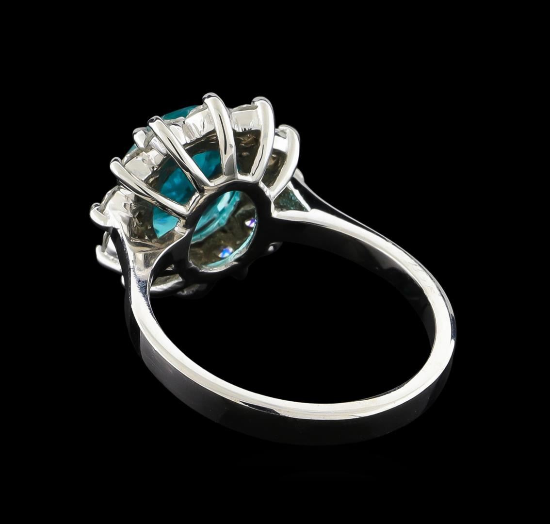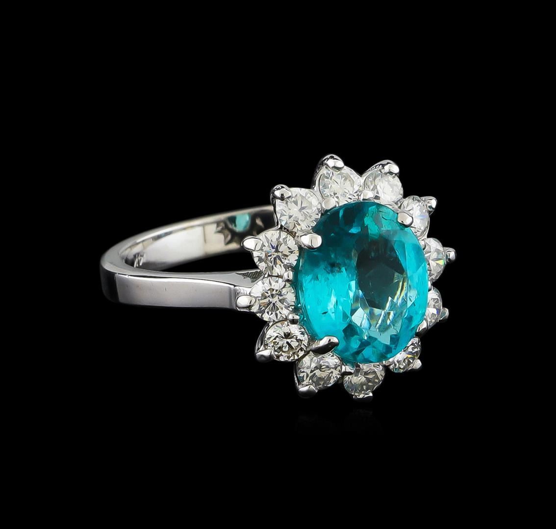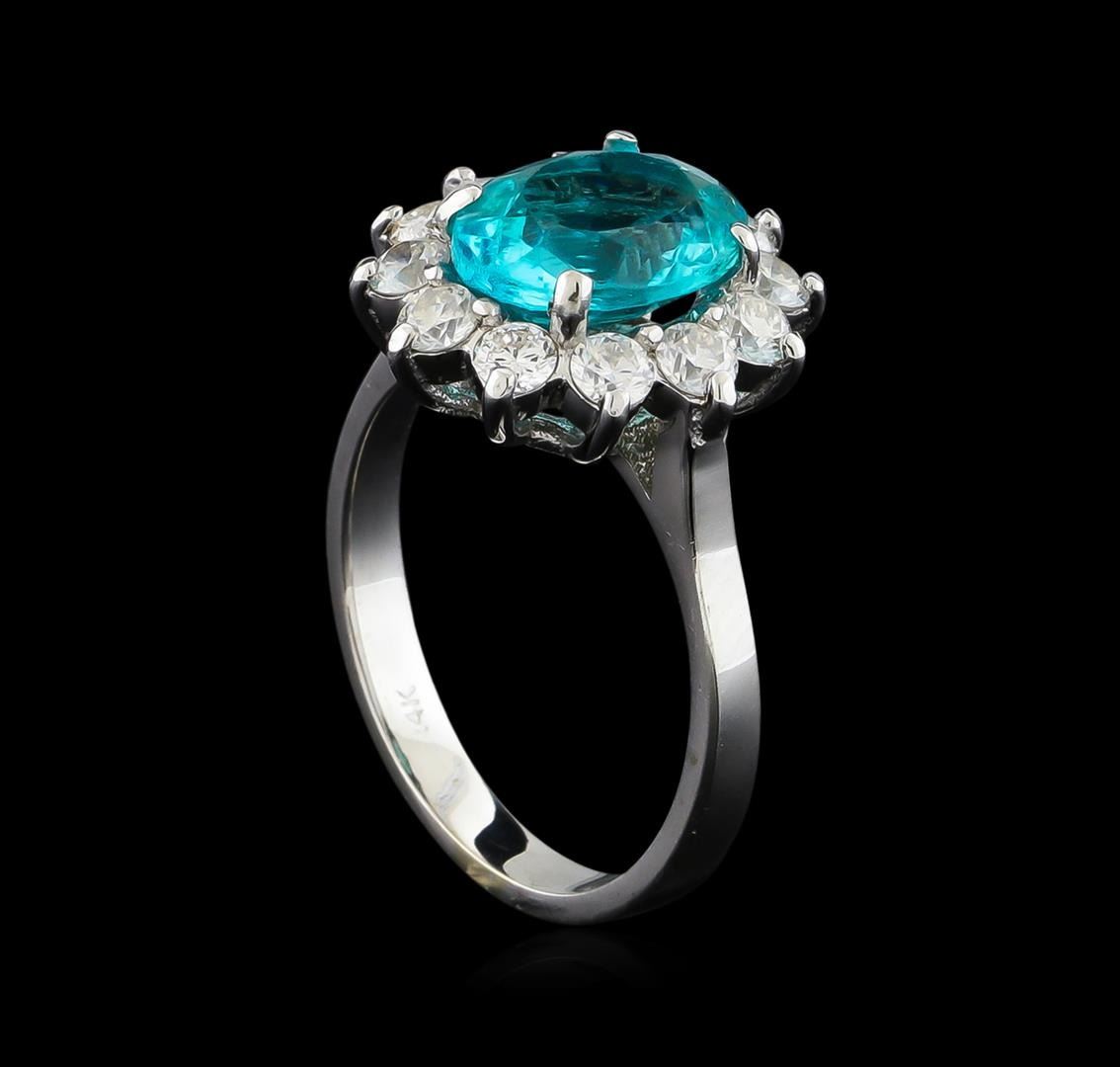 One electronically tested 14KT white gold ladies cast apatite and diamond ring with a bright polish finish. The featured apatite is set within a diamond floret bezel, completed by a two and one-half millimeter wide band. Identified with markings of "14K". Condition is new, good workmanship. Containing: One prong set oval mixed cut natural apatite, measuring 9.90 x 8.05 x 4.80mm, 6%. bulge factor, exact weight 2.78ct., clarity is slightly included, medium, very slightly grayish, greenish blue color, (GIA gB 5/3), cut is good. Transmitting light with a minimum of distortion, transparent,. Naturally occurring internal & external characteristics are present. Graded in the setting. Twelve prong set round brilliant cut diamonds, measuring 2.80 - 2.70 x 1.65mm exact total weight 12 Stones = 0.96ct. Graded in the setting. Clarity: SI-2 to I-1. Color: H - J. Total Weight of Colored Stones 2.78ct. Total Weight of Diamonds 0.96ct. Total Weight of Ring 4.97gm. AIG Appraised.