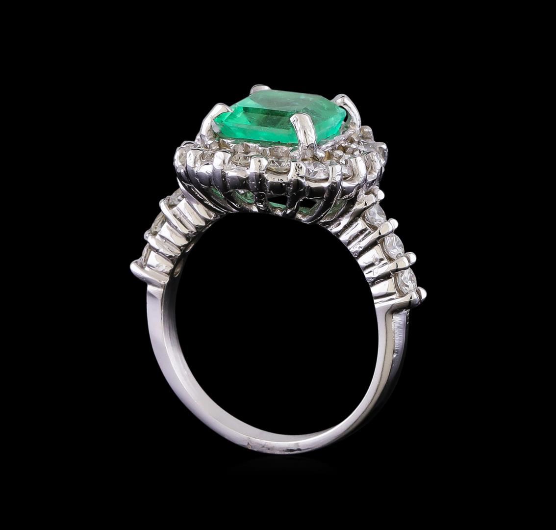 One electronically tested 14KT white gold lady's cast fashion ring with a basket halo with a bright polish finish. The featured lady's has a shank measuring 2.20 millimeters in width. Identified with markings of "14K". Condition is new, good workmanship. Containing: One prong set emerald step cut natural emerald, measuring 8.67 x 8.07 x 6.38mm, (depth est.) approximate weight of 2.78ct., clarity is moderately included, medium light, moderately strong, green color, (GIA G 4/4), cut is good. Transmitting light somewhat diffusely, transparent to translucent. Indications of oil residue. Naturally occurring internal & external characteristics are present. Colored gemstones are presumed to have been subjected to commonly used enhancement processes. Graded in the setting. Twenty-Two prong set round brilliant cut diamonds, measuring 2.35 - 2.25 x 1.44mm (depth est.) approximate total weight of 22 Stones = 1.04ct. Graded in the setting. Clarity: SI-1 to SI-2. Color: H - I. Cut Good. Total Weight of Colored Stones 2.78ct. Total Weight of Diamonds 1.04ct. Total Weight of Ring 7.00gm. GAS Appraised.