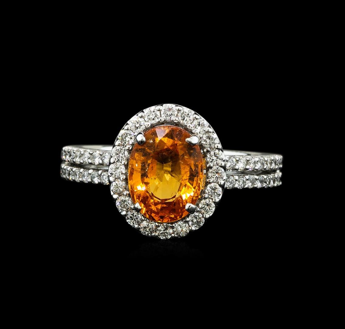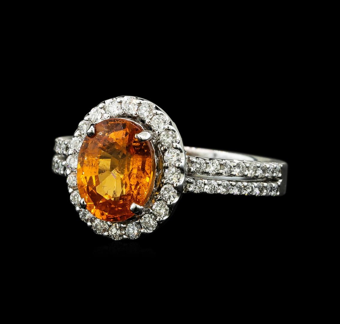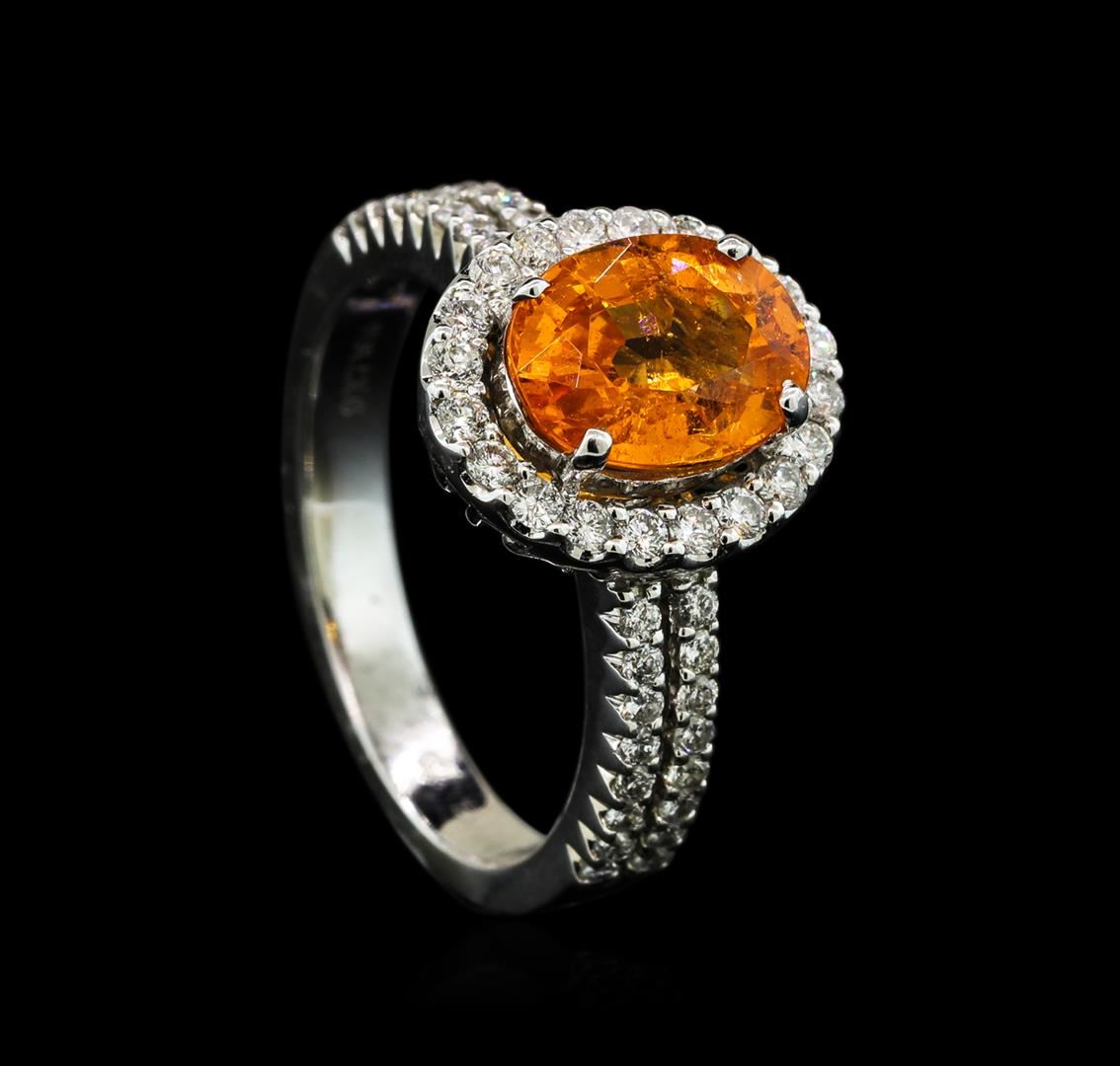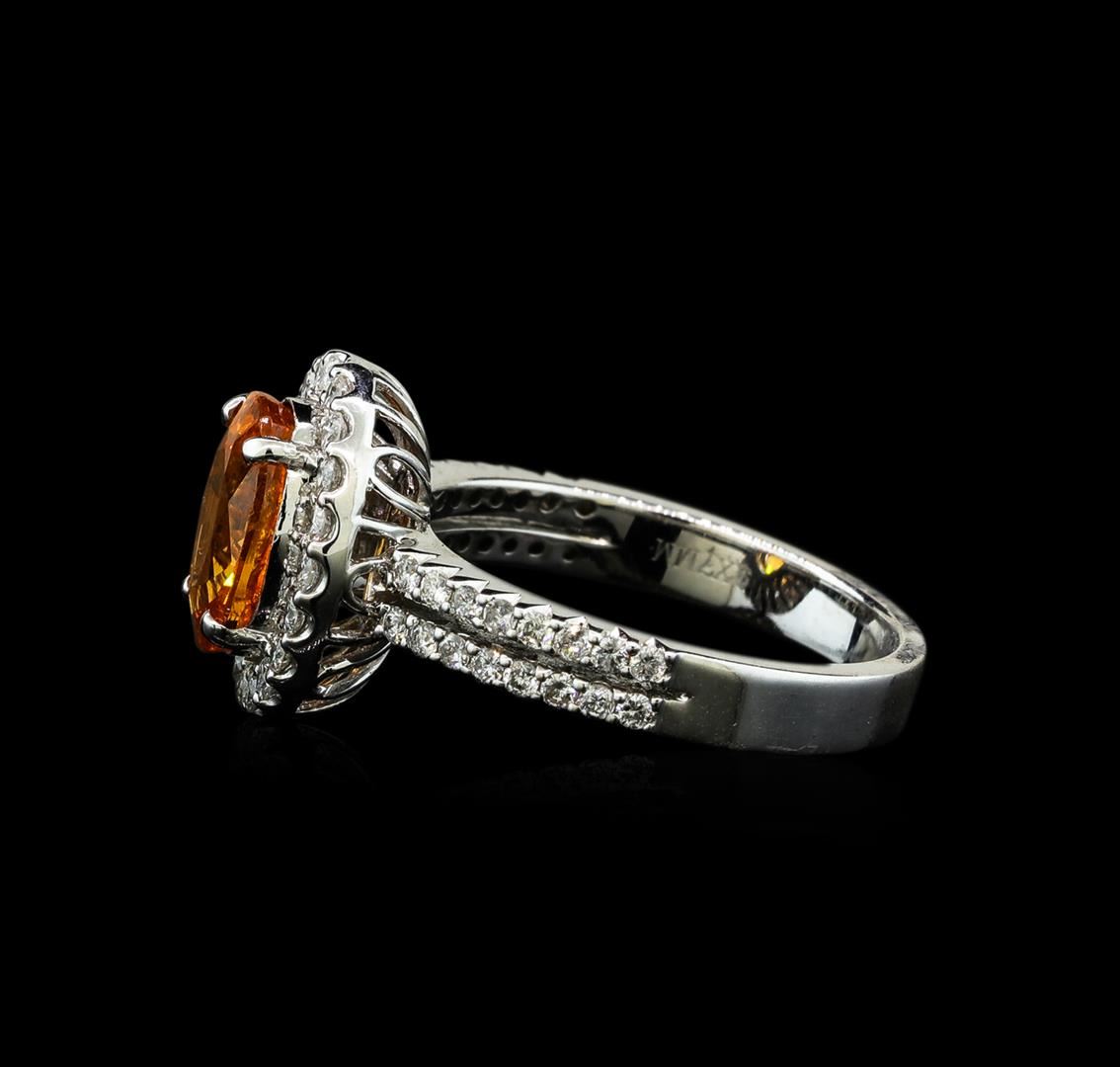 One electronically tested 14KT white gold lady's cast fashion ring with a split shank basket halo with a bright polish finish. The featured lady's ring has a shank measuring 2.86 millimeters wide. Identified with markings of '14K'. Condition is new, good workmanship. Containing: One prong set oval modified brilliant cut natural mandarin spessartite, measuring 9.08 x 7.02 x 4.44mm, (depth est.) 10%. bulge factor, approximate weight of 2.78ct., clarity is moderately included, medium, strong, orange color, (GIA O 5/5), cut is good. Transmitting light somewhat diffusely, transparent to translucent. Colored gemstones are presumed to have been subjected to commonly used enhancement processes. Graded in the setting. Twenty prong set round brilliant cut diamonds, measuring 1.50 - 1.45 x 0.92mm (depth est.) approximate total weight of 20 Stones = 0.25ct. Graded in the setting. Clarity SI-1 to SI-2. Color: G - H Cut Good Thirty-Two prong set round brilliant cut diamonds, measuring 1.40 - 1.35 x 0.86mm (depth est.) approximate total weight of 32 Stones = 0.33ct. Graded in the setting. Clarity SI-1 to SI-2. Color: G - H Cut Good. Total Weight of Colored Stones 2.78ct.. Total Weight of Diamonds 0.58ct.. Total Weight of Ring 5.10gm GAS Appraised at $5,150.00.