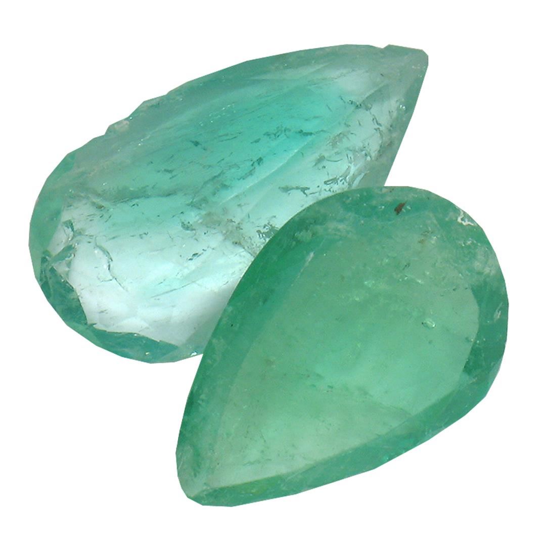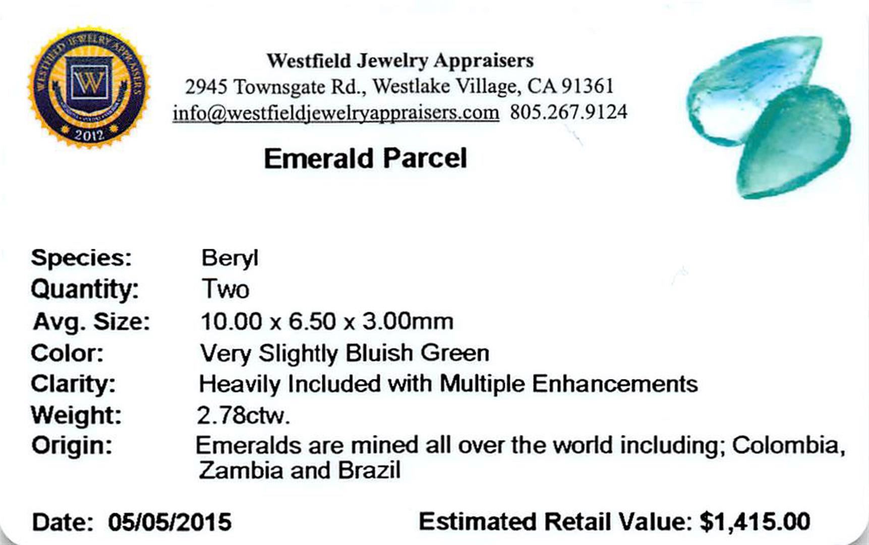 Two pear cut natural emeralds, measuring 10.00 x 6.50 x 3.00mm, exact total weight 2.78ct., clarity is moderately included, type III, medium dark, very slightly grayish, very slightly bluish green color, (GIA vslbG 6/3) Indications of multiple laboratory enhancements, including high temperature heat treatment. Westfield Appraised at $1,415.00.