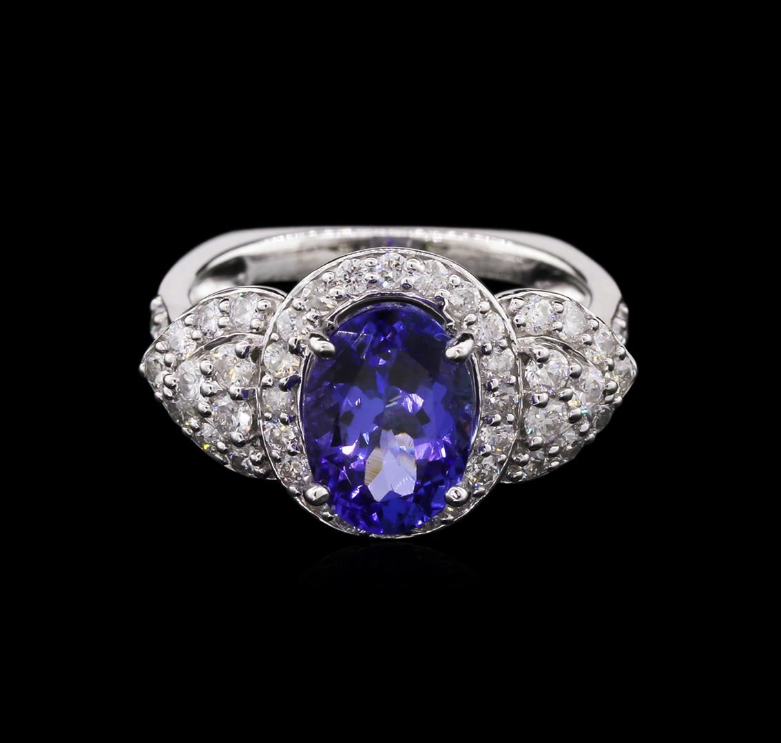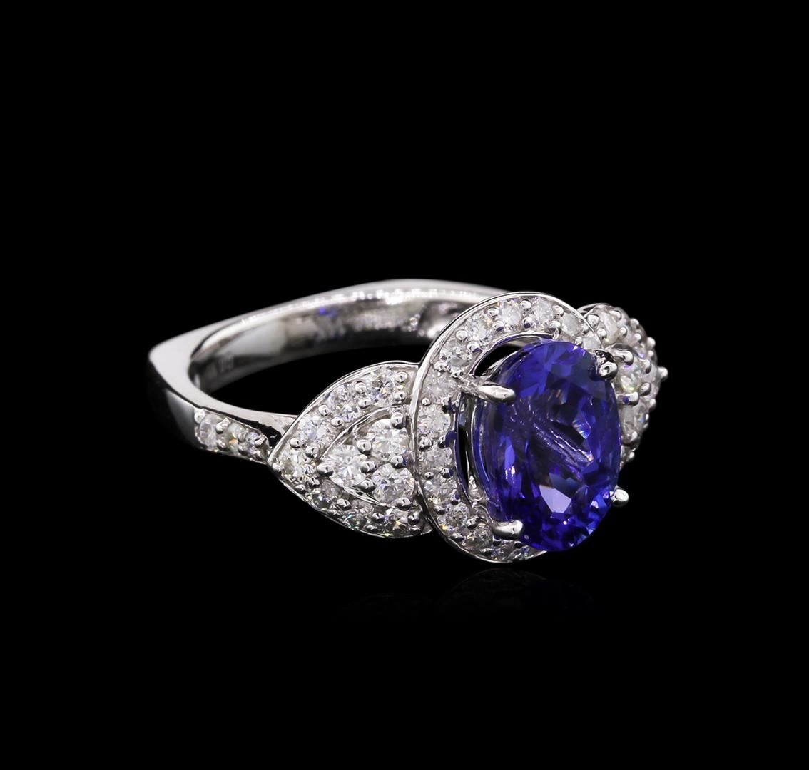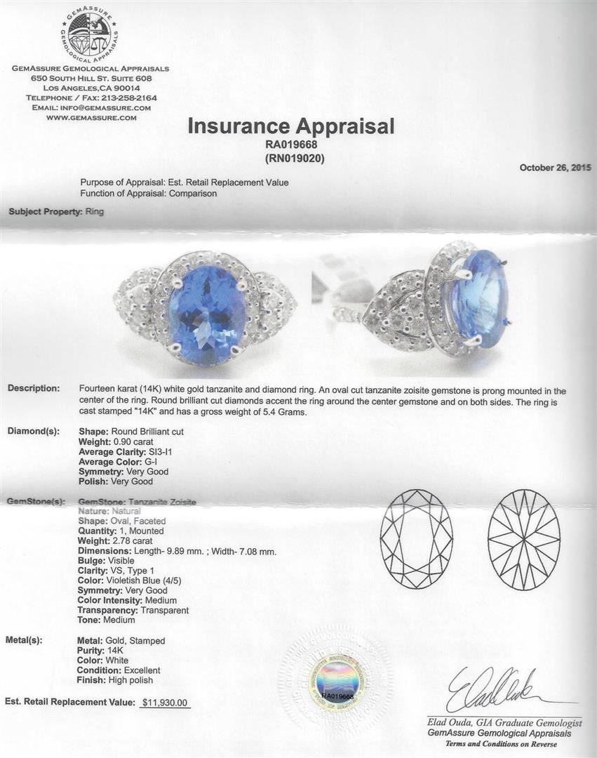 Fourteen karat (14K) white gold tanzanite and diamond ring. An oval cut tanzanite zoisite gemstone is prong mounted in the center of the ring. Round brilliant cut diamonds accent the ring around the center gemstone and on both sides. The ring is cast stam GGA Appraised.