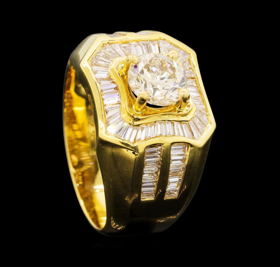 One electronically tested 18KT yellow gold lady's cast wedding ring with a tapered wide band with a bright polish finish. The featured lady's ring has a shank measuring 6.50 millimeters wide. Condition is new, good workmanship. Containing: One prong set round brilliant cut diamond, measuring 7.12 - 7.01 x 4.66mm (depth est.) approximate weight of 1.49ct. Graded loose prior to setting in the GIA Laboratory, Report #1172859551. Color U - V Clarity I-1 Cut Good Twenty channel set baguette cut diamonds, measuring from 1.90 x 1.35 x 1.15mm (depth est.) to 2.10 x 1.40 x 1.19mm (depth est.) approximate total weight of 20 Stones = 0.60ct. Graded in the setting. Color H - I Clarity VS-1 to VS-2 Cut Very Good Thirty-Five channel set baguette cut (tapered) diamonds, measuring from 1.80 x 1.10 x 0.94mm (depth est.) to 2.10 x 1.20 x 1.02mm (depth est.) approximate total weight of 35 Stones = 0.70ct. Graded in the setting. Color H - I Clarity VS-1 to VS-2 Cut Very Good. Total Weight of Diamonds 2.79ct.. Total Weight of Ring 11.70gm GAS Appraised at $14,430.00.