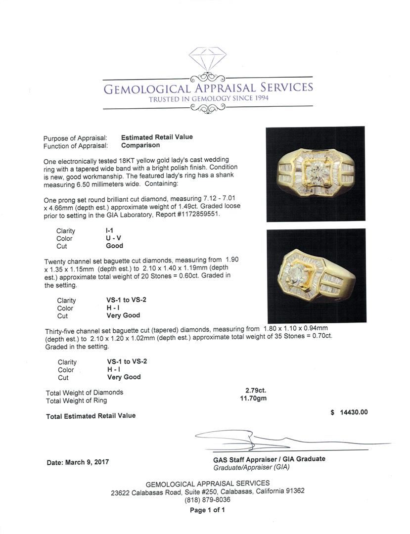 One electronically tested 18KT yellow gold lady's cast wedding ring with a tapered wide band with a bright polish finish. The featured lady's ring has a shank measuring 6.50 millimeters wide. Condition is new, good workmanship. Containing: One prong set round brilliant cut diamond, measuring 7.12 - 7.01 x 4.66mm (depth est.) approximate weight of 1.49ct. Graded loose prior to setting in the GIA Laboratory, Report #1172859551. Color U - V Clarity I-1 Cut Good Twenty channel set baguette cut diamonds, measuring from 1.90 x 1.35 x 1.15mm (depth est.) to 2.10 x 1.40 x 1.19mm (depth est.) approximate total weight of 20 Stones = 0.60ct. Graded in the setting. Color H - I Clarity VS-1 to VS-2 Cut Very Good Thirty-Five channel set baguette cut (tapered) diamonds, measuring from 1.80 x 1.10 x 0.94mm (depth est.) to 2.10 x 1.20 x 1.02mm (depth est.) approximate total weight of 35 Stones = 0.70ct. Graded in the setting. Color H - I Clarity VS-1 to VS-2 Cut Very Good. Total Weight of Diamonds 2.79ct.. Total Weight of Ring 11.70gm GAS Appraised at $14,430.00.