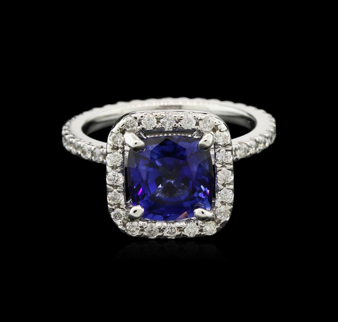 One electronically tested 14KT white gold ladies cast sapphire and diamond ring with a bright polish finish. The featured sapphire is set within a diamond bezel supported by a diamond accented under gallery and diamond set shoulders, completed by a continuous one and one-half millimeter wide diamond set band. Ring size 5.75. Condition is new, good workmanship. Containing: One prong set square cushion mixed cut natural blue sapphire, measuring 7.70 x 7.60 x 4.85mm, 6% bulge factor, exact weight 2.80 ct., clarity is eye clean, type II, dark, moderately strong, blue color, (GIA B 7/4), cut is good. Transmitting light with no distortion, transparent. Indications of laboratory high temperature diffusion treatment. Graded in the setting. Sixty-Eight prong set round brilliant cut diamonds exact total weight 68 Stones = 0.68ct. Graded in the setting. Clarity: SI-2 to I-1. Color: G - I. Total Weight of Colored Stones 2.80 ct. Total Weight of Diamonds 0.68ct. Total Weight of Ring 3.53gm. AIG Appraised.