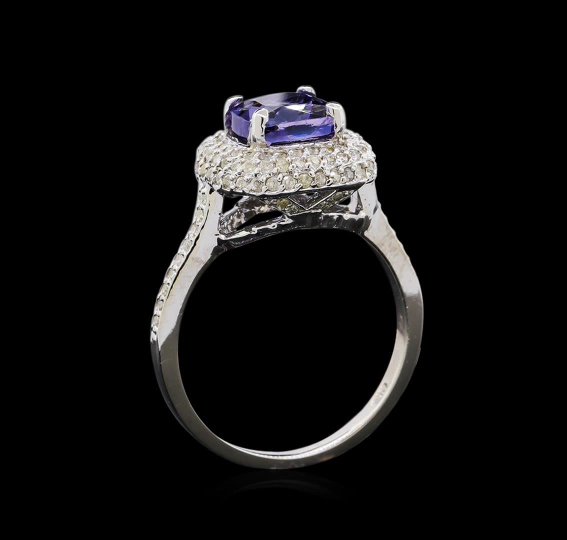 One electronically tested 14KT white gold ladies cast tanzanite and diamond ring with a bright polish finish. The featured tanzanite is set within a tiered diamond bezel supported by diamond set shoulders, completed by a one and one-half millimeter wide band. Identified with markings of "K14". Condition is new, good workmanship. Containing: One prong set square cushion mixed cut natural tanzanite, measuring 7.35 x 7.30 x 5.40mm, 15%. bulge factor, approximate weight of 2.80ct., clarity is eye clean, type I, dark, very slightly grayish, blue color, (GIA B 7/3), cut is good. Natural Tanzanite, color enhanced due to cobalt coating. The presence of the coating prevents determining the stone's actual depth of color. Transmitting light with no distortion, transparent. Grading in the setting. The cobalt coated Tanzanite has a low tolerance to ultrasonic cleaning, and should not be cleaned using this method. Tanzanite is a very rare gemstone that is only found in the country of Tanzania. Originally discovered in 1967. Tiffany & Company, named the stone Tanzanite. It is found in the Usumburu Mountains that border the Umba Valley of northern Tanzania. Tanzanite occurs in gray, brown, violet, blue, reddish-purple, & green. The gem is interesting because of its exceptional pleochroism. Rotated in different directions a tanzanite will exhibit multiple changes of color. One Hundred Seventeen prong set round brilliant cut diamonds, measuring 1.20 - 1.10 x 0.69mm (depth est.) approximate total weight of 117 Stones = 0.68ct. Faint brown secondary color throughout. Graded in the setting. Clarity: I-1 to I-3. Color: K - M. Total Weight of Colored Stones 2.80ct. Total Weight of Diamonds 0.68ct. Total Weight of Ring 5.38gm. AIG Appraised at $4,080.00.