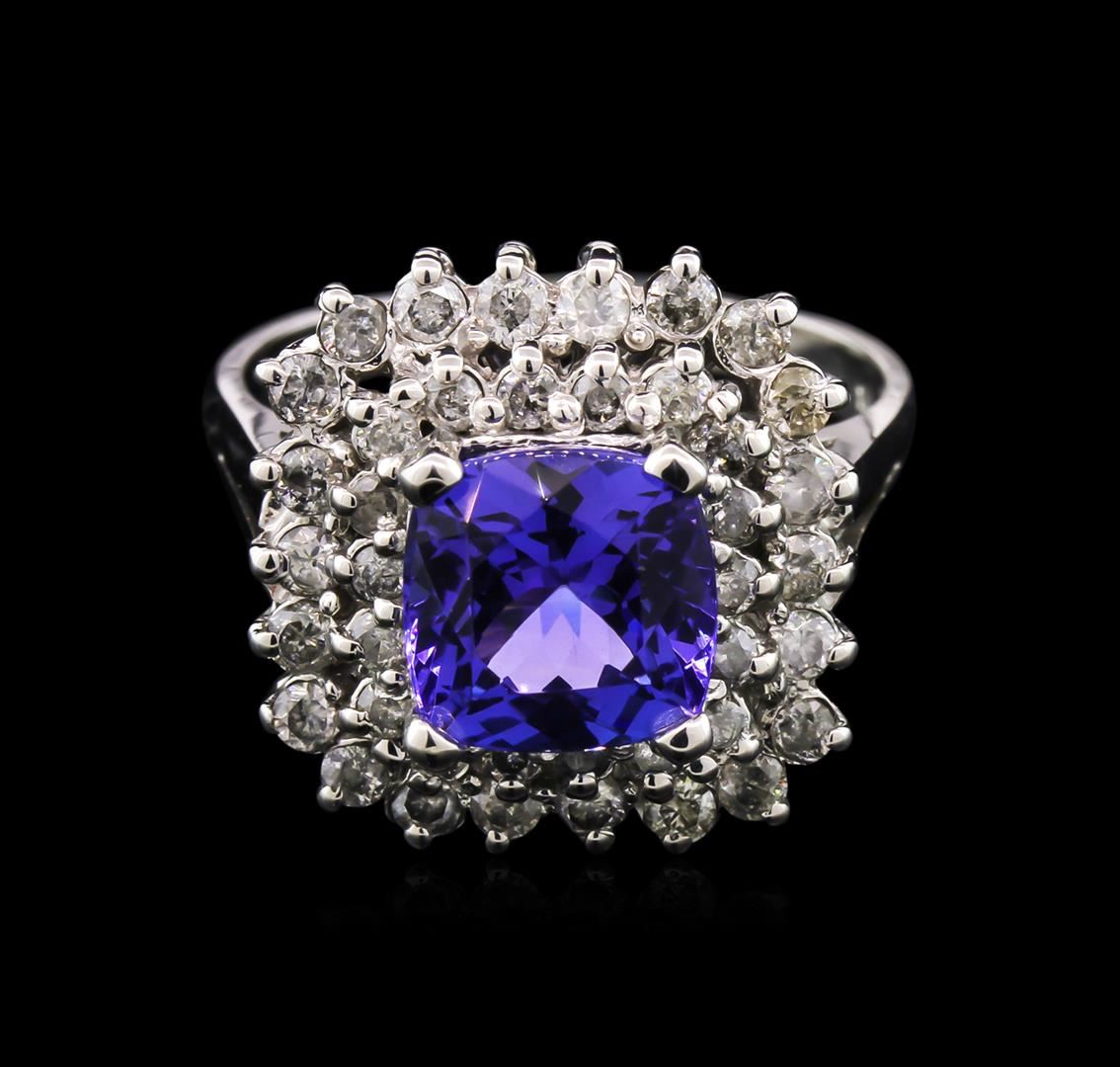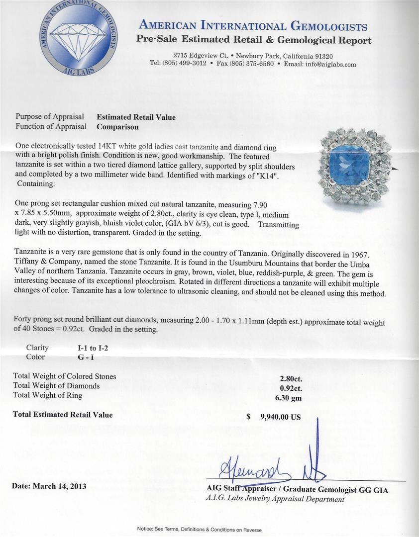 One electronically tested white gold ladies cast tanzanite and diamond ring with a bright polish finish. Condition is new, good workmanship. The featured tanzanite is set within a two tiered diamond lattice gallery, supported by split shoulders and completed by a two millimeter wide band. Identified with markings of "K14". Containing: One prong set rectangular cushion mixed cut natural tanzanite, measuring 7.90 x 7.85 x 5.50mm, approximate weight of 2.80ct., clarity is eye clean, type I, medium dark, very slightly grayish, bluish violet color, (GIA bV 6/3),cut is good. Transmitting light with no distortion, transparent. Graded in the setting. Tanzanite is a very rare gemstone that is only found in the country of Tanzania. Originally discovered in 1967.Tiffany & Company, named the stone Tanzanite. It is found in the Usumburu Mountains that border the UmbaValley of northern Tanzania. Tanzanite occurs in gray, brown, violet, blue, reddish-purple, & green. The gem is interesting because of its exceptional pleochroism. Rotated in different directions a tanzanite will exhibit multiple changes of color. Tanzanite has a low tolerance to ultrasonic cleaning, and should not be cleaned using this method. Forty prong set round brilliant cut diamonds, measuring 2.00 - 1.70 x 1.11mm (depth est.) approximate total weight of 40 Stones = 0.92ct. Graded in the setting. Clarity: I-1 to I-2.Color: G - I. AIG Appraised at $9,940.00.