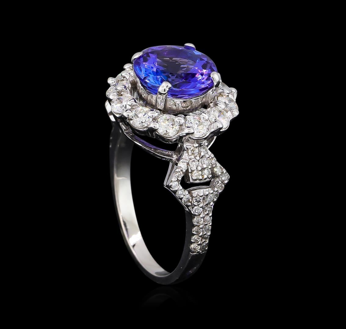 One electronically tested 14KT white gold lady's cast fashion ring with a basket halo with a bright polish finish. The featured lady's ring has a shank measuring 1.88 millimeters wide. Identified with markings of "K14". Condition is new, good workmanship. Containing: One prong set round modified brilliant cut natural tanzanite, measuring 8.91 - 8.90 x 5.37 mm, approximate weight of 2.80ct., clarity is eye clean, type I, medium dark, moderately strong, violetish blue color, (GIA vB 6/4), cut is very good. Transmitting light with no distortion, transparent. Colored gemstones are presumed to have been subjected to commonly used enhancement processes. Graded in the setting. Twelve prong set round brilliant cut diamonds, measuring 2.60 - 2.50 x 1.58mm (depth est.) approximate total weight of 12 Stones = 0.75ct. Graded in the setting. Clarity: VS-2 to SI-2. Color: H - I. Cut Very Good Fifty-Six prong set round brilliant cut diamonds, measuring 1.15 - 1.05 x 0.68mm (depth est.) approximate total weight of 56 Stones = 0.28ct. Graded in the setting. Clarity: SI-2 to I-1. Color: H - I. Cut Good. Total Weight of Colored Stones 2.80ct. Total Weight of Diamonds 1.03ct. Total Weight of Ring 5.40gm. GAS Appraised at $8,175.00.