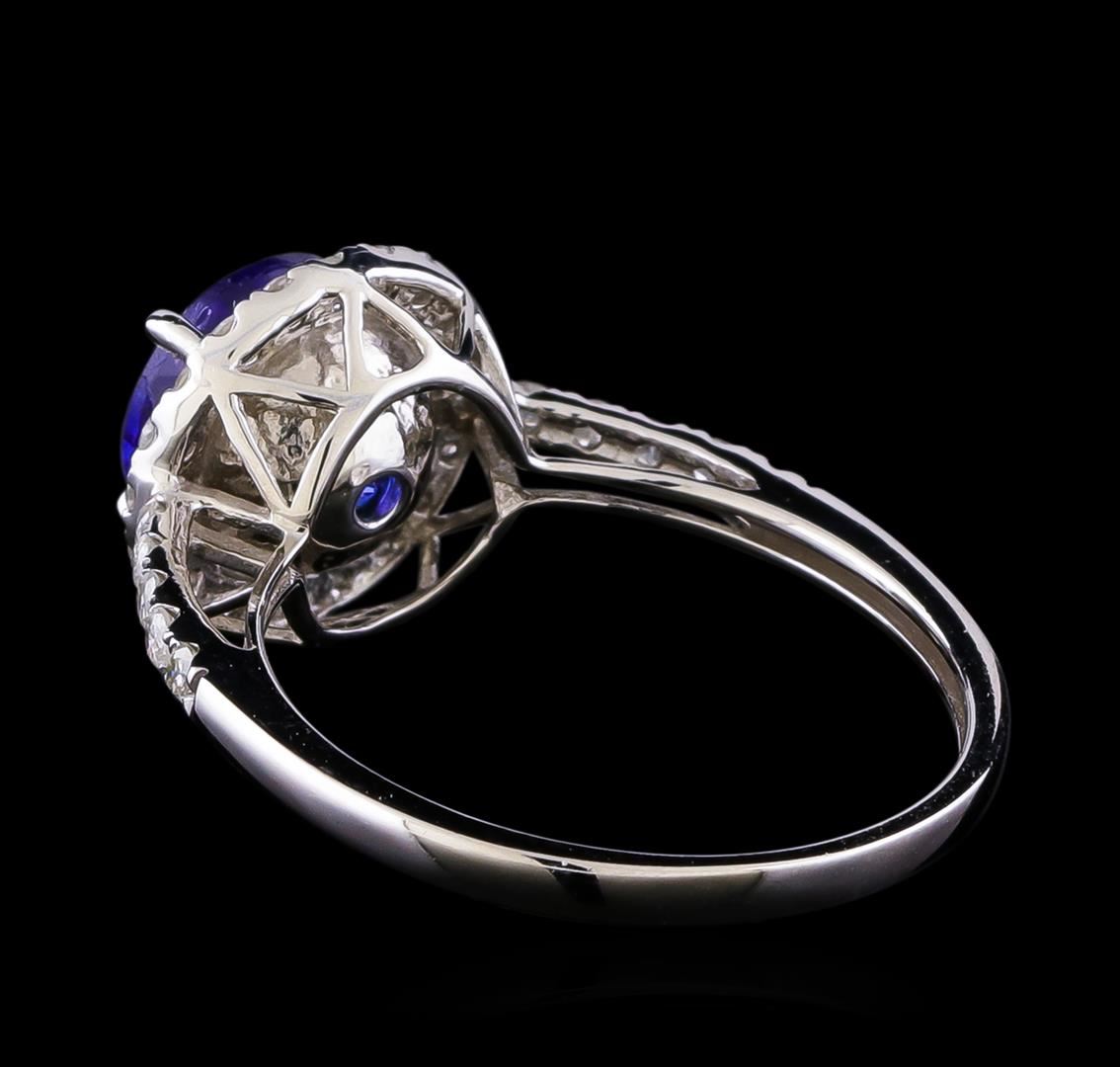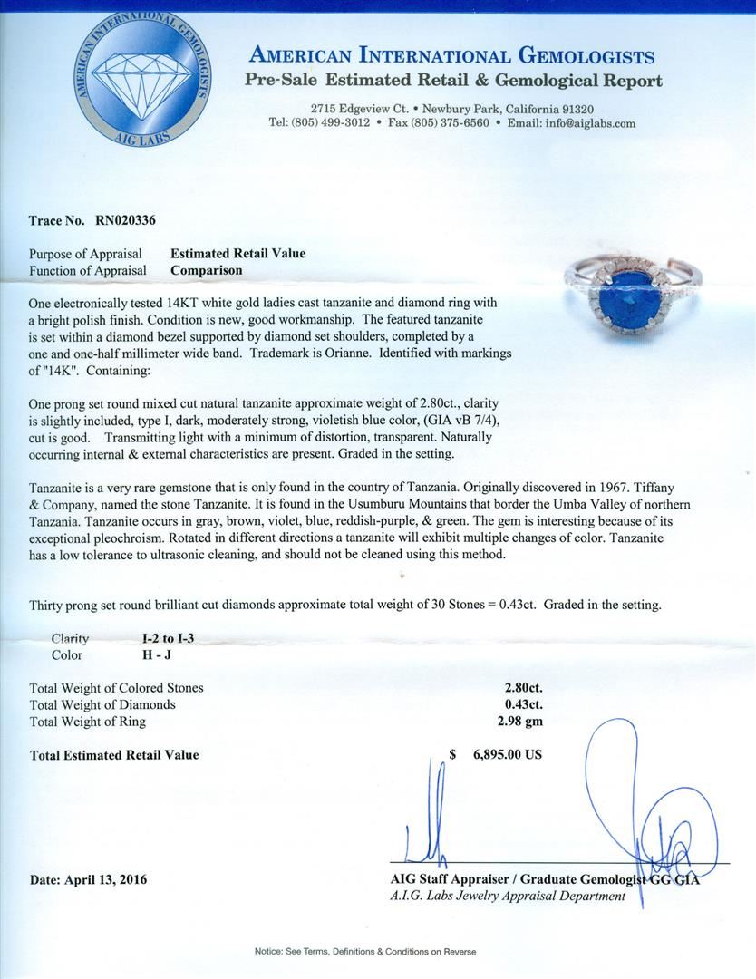 One electronically tested 14KT white gold ladies cast tanzanite and diamond ring with a bright polish finish. The featured tanzanite is set within a diamond bezel supported by diamond set shoulders, completed by a one and one-half millimeter wide band. Trademark is Orianne. Identified with markings of "14K". Condition is new, good workmanship. Containing: One prong set round mixed cut natural tanzanite approximate weight of 2.80ct., clarity is slightly included, type I, dark, moderately strong, violetish blue color, (GIA vB 7/4), cut is good. Transmitting light with a minimum of distortion, transparent. Naturally occurring internal & external characteristics are present. Graded in the setting. Tanzanite is a very rare gemstone that is only found in the country of Tanzania. Originally discovered in 1967. Tiffany & Company, named the stone Tanzanite. It is found in the Usumburu Mountains that border the Umba Valley of northern Tanzania. Tanzanite occurs in gray, brown, violet, blue, reddish-purple, & green. The gem is interesting because of its exceptional pleochroism. Rotated in different directions a tanzanite will exhibit multiple changes of color. Tanzanite has a low tolerance to ultrasonic cleaning, and should not be cleaned using this method. Thirty prong set round brilliant cut diamonds approximate total weight of 30 Stones = 0.43ct. Graded in the setting. Clarity: I-2 to I-3. Color: H - J. Total Weight of Colored Stones 2.80ct. Total Weight of Diamonds 0.43ct. Total Weight of Ring 2.98gm. AIG Appraised at $6,895.00.