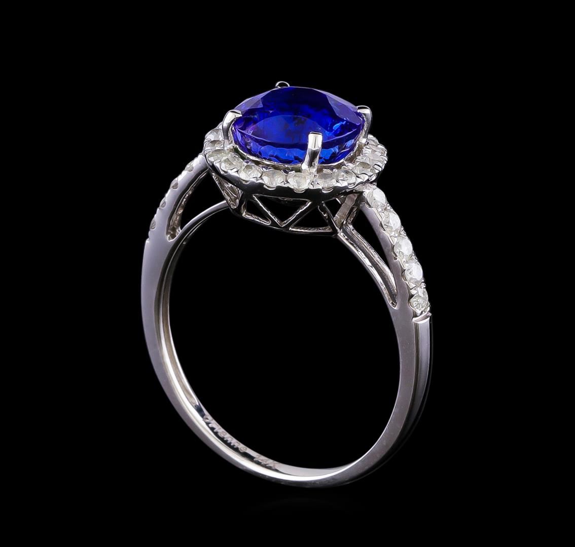 One electronically tested 14KT white gold ladies cast tanzanite and diamond ring with a bright polish finish. The featured tanzanite is set within a diamond bezel supported by diamond set shoulders, completed by a one and one-half millimeter wide band. Trademark is Orianne. Identified with markings of "14K". Condition is new, good workmanship. Containing: One prong set round mixed cut natural tanzanite approximate weight of 2.80ct., clarity is slightly included, type I, dark, moderately strong, violetish blue color, (GIA vB 7/4), cut is good. Transmitting light with a minimum of distortion, transparent. Naturally occurring internal & external characteristics are present. Graded in the setting. Tanzanite is a very rare gemstone that is only found in the country of Tanzania. Originally discovered in 1967. Tiffany & Company, named the stone Tanzanite. It is found in the Usumburu Mountains that border the Umba Valley of northern Tanzania. Tanzanite occurs in gray, brown, violet, blue, reddish-purple, & green. The gem is interesting because of its exceptional pleochroism. Rotated in different directions a tanzanite will exhibit multiple changes of color. Tanzanite has a low tolerance to ultrasonic cleaning, and should not be cleaned using this method. Thirty prong set round brilliant cut diamonds approximate total weight of 30 Stones = 0.43ct. Graded in the setting. Clarity: I-2 to I-3. Color: H - J. Total Weight of Colored Stones 2.80ct. Total Weight of Diamonds 0.43ct. Total Weight of Ring 2.98gm. AIG Appraised at $6,895.00.