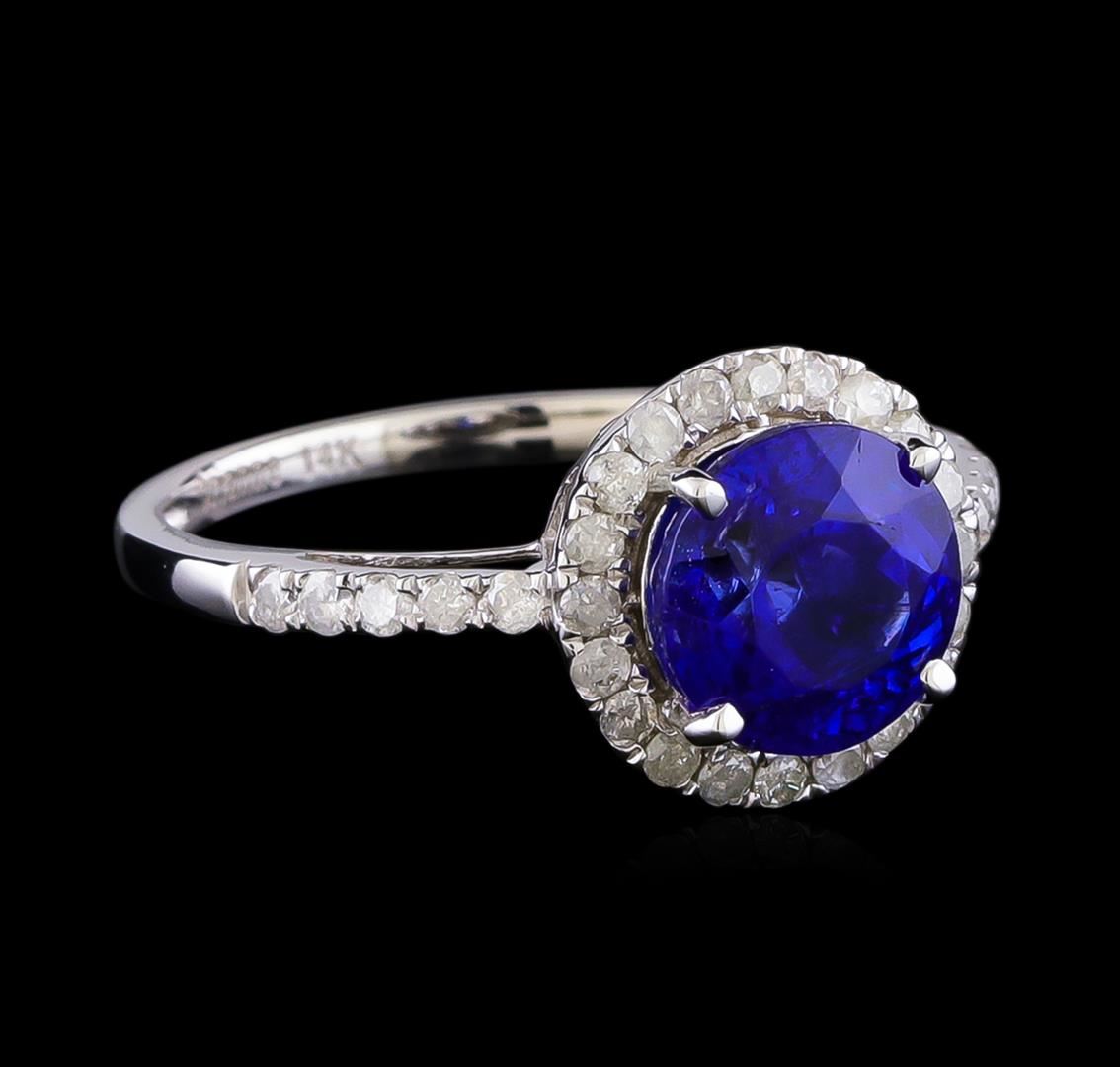 One electronically tested 14KT white gold ladies cast tanzanite and diamond ring with a bright polish finish. The featured tanzanite is set within a diamond bezel supported by diamond set shoulders, completed by a one and one-half millimeter wide band. Trademark is Orianne. Identified with markings of "14K". Condition is new, good workmanship. Containing: One prong set round mixed cut natural tanzanite approximate weight of 2.80ct., clarity is slightly included, type I, dark, moderately strong, violetish blue color, (GIA vB 7/4), cut is good. Transmitting light with a minimum of distortion, transparent. Naturally occurring internal & external characteristics are present. Graded in the setting. Tanzanite is a very rare gemstone that is only found in the country of Tanzania. Originally discovered in 1967. Tiffany & Company, named the stone Tanzanite. It is found in the Usumburu Mountains that border the Umba Valley of northern Tanzania. Tanzanite occurs in gray, brown, violet, blue, reddish-purple, & green. The gem is interesting because of its exceptional pleochroism. Rotated in different directions a tanzanite will exhibit multiple changes of color. Tanzanite has a low tolerance to ultrasonic cleaning, and should not be cleaned using this method. Thirty prong set round brilliant cut diamonds approximate total weight of 30 Stones = 0.43ct. Graded in the setting. Clarity: I-2 to I-3. Color: H - J. Total Weight of Colored Stones 2.80ct. Total Weight of Diamonds 0.43ct. Total Weight of Ring 2.98gm. AIG Appraised at $6,895.00.