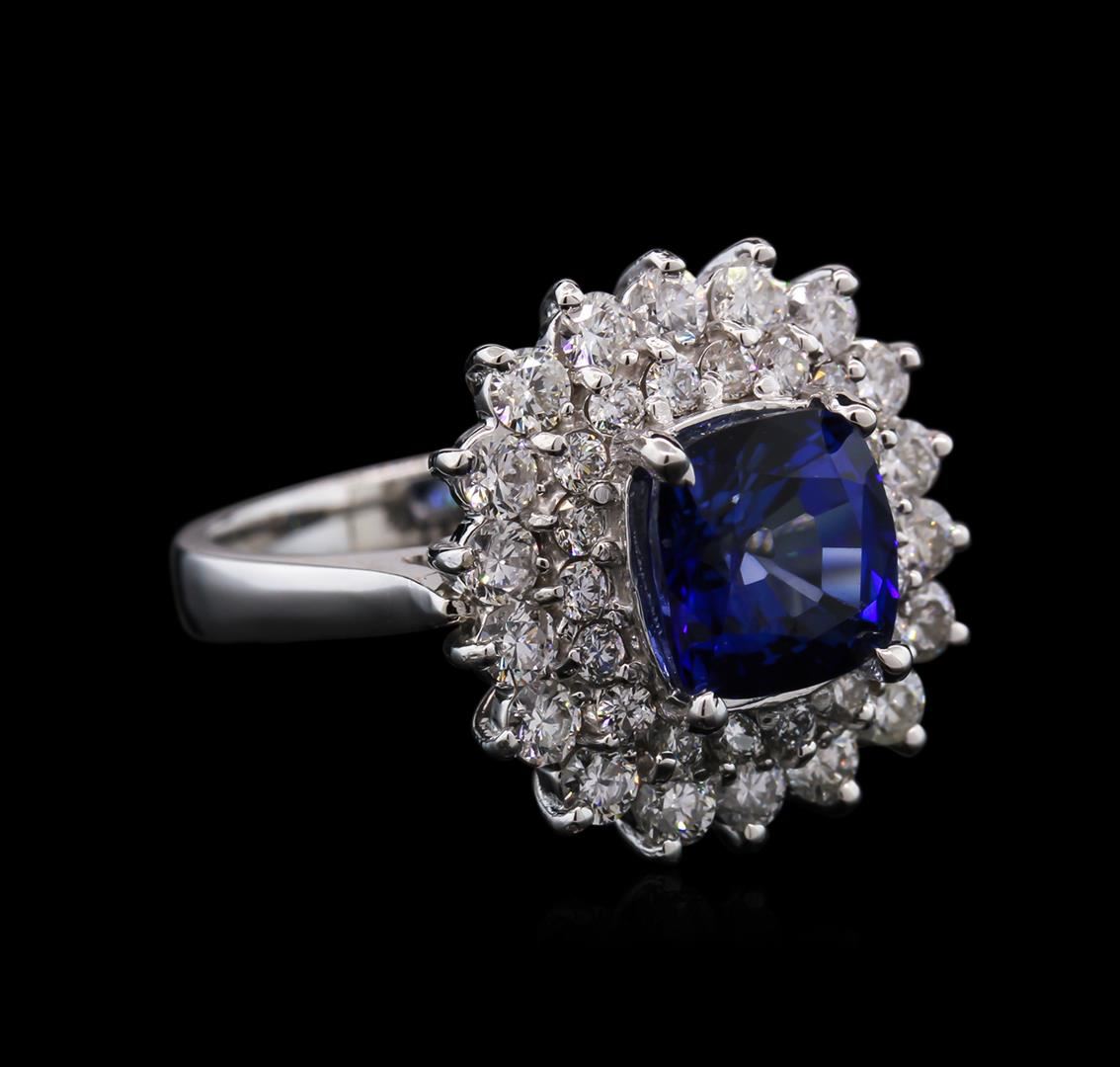 One electronically tested 14KT white gold lady's cast fashion ring with a basket double halo with a bright polish finish. The featured ladies ring has a shank measuring 2.90 millimeters in width. Identified with markings of "K14". Condition is new, good workmanship. Containing: One prong set square cushion modified brilliant cut natural tanzanite, measuring 7.98 x 7.96 x 5.54mm, approximate weight of 2.80ct., clarity is eye clean, type I, medium dark, moderately strong, violetish blue color, (GIA vB 6/4), cut is very good. Transmitting light with no distortion, transparent. Colored gemstones are presumed to have been subjected to commonly used enhancement processes. Graded in the setting. Eighteen prong set round brilliant cut diamonds, measuring 2.30 - 2.20 x 1.46mm (depth est.) approximate total weight of 18 Stones = 0.81ct. Graded in the setting. Clarity: SI-2 to I-1. Color: H - I. Cut Good Eighteen prong set round brilliant cut diamonds, measuring 1.80 - 1.70 x 1.14mm (depth est.) approximate total weight of 18 Stones = 0.40ct. Graded in the setting. Clarity: SI-1 to SI-2. Color: H - I. Cut Good. Total Weight of Colored Stones 2.80ct. Total Weight of Diamonds 1.21ct. Total Weight of Ring 7.00gm. GAS Appraised at $8,720.00.
