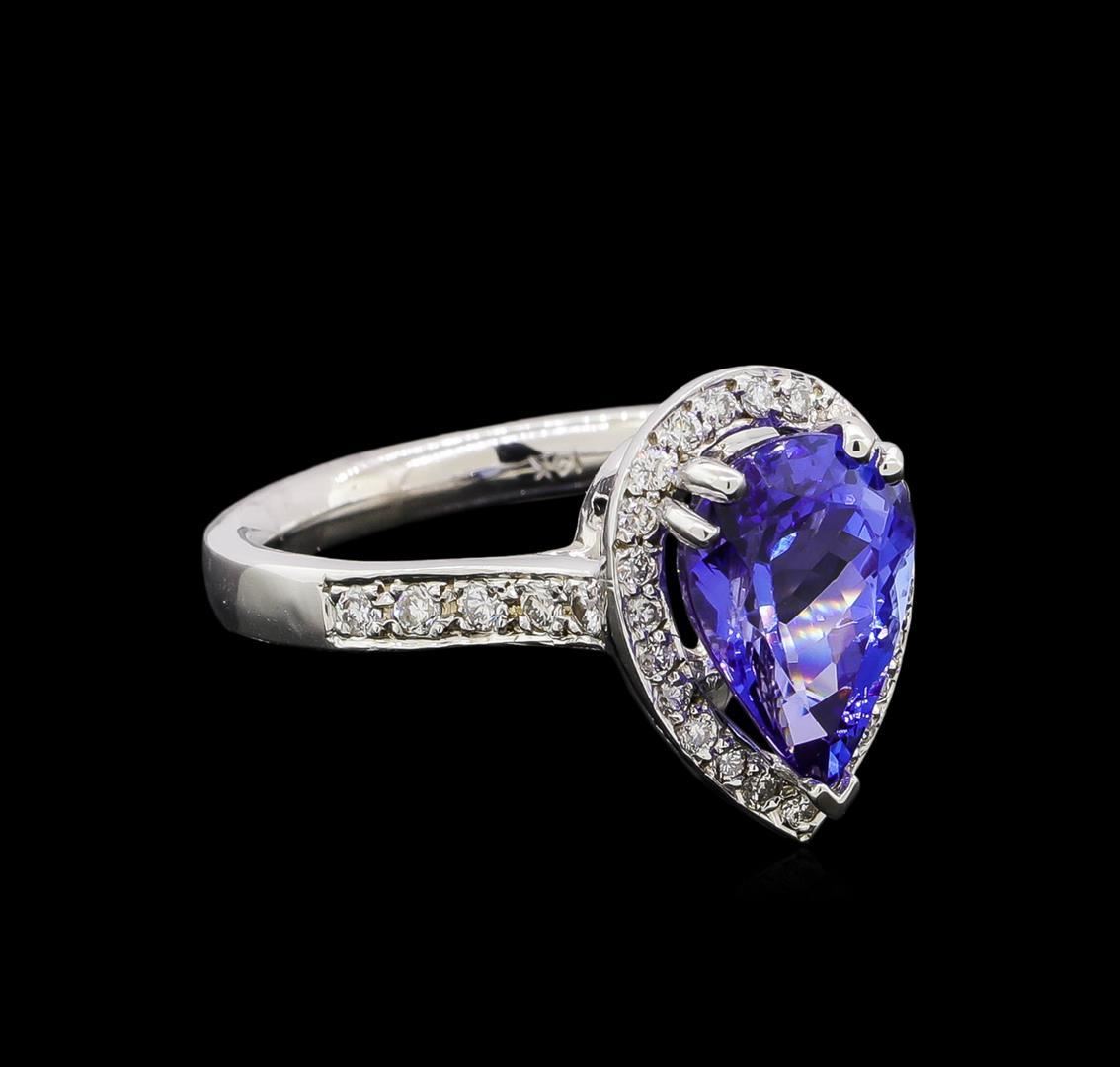 One electronically tested 14KT white gold lady's cast fashion ring with a cathedral halo with a bright polish finish. The featured lady's ring has a shank measuring 2.50 millimeters wide. Identified with markings of '14K'. Condition is new, good workmanship. Containing: One prong set pear modified brilliant cut natural tanzanite, measuring 11.06 x 7.77 x 5.20mm, (depth est.) approximate weight of 2.80 ct., clarity is eye clean, medium dark, strong, violetish blue color, (GIA vB 6/5), cut is excellent. Transmitting light with no distortion, transparent. Colored gemstones are presumed to have been subjected to commonly used enhancement processes. Graded in the setting. Ten prong set round brilliant cut diamonds, measuring 1.70 - 1.65 x 1.04mm (depth est.) approximate total weight of 10 Stones = 0.18ct. Graded in the setting. Clarity SI-1 to SI-2. Color: H - I Cut Good Twenty-Two prong set round brilliant cut diamonds, measuring 1.35 - 1.25 x 0.81mm (depth est.) approximate total weight of 22 Stones = 0.18ct. Graded in the setting. Clarity SI-1 to SI-2. Color: H - I Cut Good. Total Weight of Colored Stones 2.80 ct.. Total Weight of Diamonds 0.36ct.. Total Weight of Ring 5.70gm.