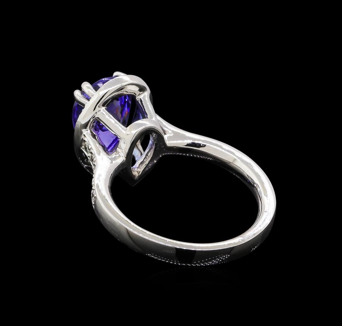 One electronically tested 14KT white gold lady's cast fashion ring with a cathedral halo with a bright polish finish. The featured lady's ring has a shank measuring 2.50 millimeters wide. Identified with markings of '14K'. Condition is new, good workmanship. Containing: One prong set pear modified brilliant cut natural tanzanite, measuring 11.06 x 7.77 x 5.20mm, (depth est.) approximate weight of 2.80 ct., clarity is eye clean, medium dark, strong, violetish blue color, (GIA vB 6/5), cut is excellent. Transmitting light with no distortion, transparent. Colored gemstones are presumed to have been subjected to commonly used enhancement processes. Graded in the setting. Ten prong set round brilliant cut diamonds, measuring 1.70 - 1.65 x 1.04mm (depth est.) approximate total weight of 10 Stones = 0.18ct. Graded in the setting. Clarity SI-1 to SI-2. Color: H - I Cut Good Twenty-Two prong set round brilliant cut diamonds, measuring 1.35 - 1.25 x 0.81mm (depth est.) approximate total weight of 22 Stones = 0.18ct. Graded in the setting. Clarity SI-1 to SI-2. Color: H - I Cut Good. Total Weight of Colored Stones 2.80 ct.. Total Weight of Diamonds 0.36ct.. Total Weight of Ring 5.70gm.