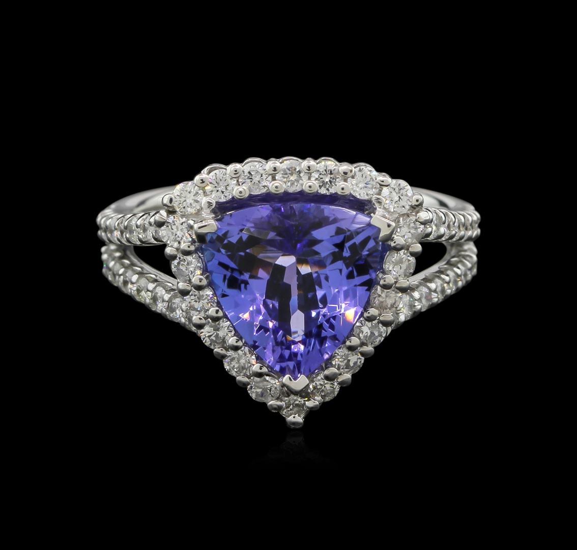 One electronically tested 14KT white gold ladies cast tanzanite and diamond ring with a bright polish finish. The featured tanzanite is set within a diamond bezel supported by diamond set split shoulders, completed by a grooved two and one-half millimeter wide band. Identified with markings of "14K". Condition is new, good workmanship. Containing: One prong set triangle mixed cut natural tanzanite approximate weight of 2.80ct., clarity is eye clean, type I, medium dark, moderately strong, violetish blue color, (GIA vB 6/4), cut is good. Transmitting light with no distortion, transparent. Graded in the setting. Tanzanite is a very rare gemstone that is only found in the country of Tanzania. Originally discovered in 1967. Tiffany & Company, named the stone Tanzanite. It is found in the Usumburu Mountains that border the Umba Valley of northern Tanzania. Tanzanite occurs in gray, brown, violet, blue, reddish-purple, & green. The gem is interesting because of its exceptional pleochroism. Rotated in different directions a tanzanite will exhibit multiple changes of color. Tanzanite has a low tolerance to ultrasonic cleaning, and should not be cleaned using this method. Fifty-Six prong set round brilliant cut diamonds approximate total weight of 56 Stones = 0.83ct. Graded in the setting. Clarity SI-2 to I-1 Color G - I. Total Weight of Colored Stones 2.80ct. Total Weight of Diamonds 0.83ct. Total Weight of Ring 5.64 grams. AIG Appraised at $9,440.00.