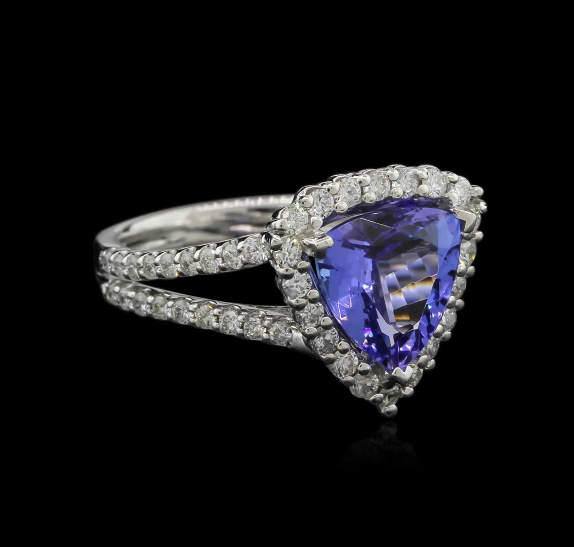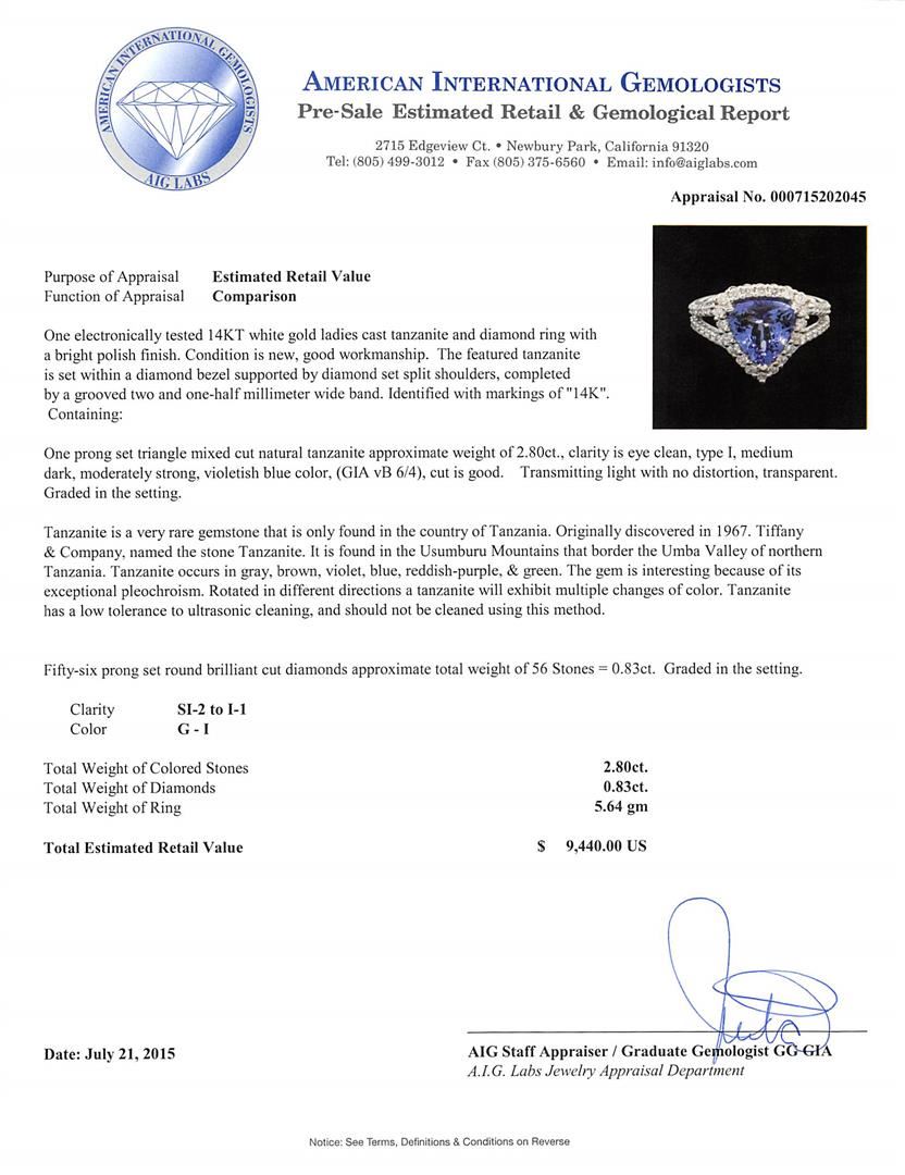 One electronically tested 14KT white gold ladies cast tanzanite and diamond ring with a bright polish finish. The featured tanzanite is set within a diamond bezel supported by diamond set split shoulders, completed by a grooved two and one-half millimeter wide band. Identified with markings of "14K". Condition is new, good workmanship. Containing: One prong set triangle mixed cut natural tanzanite approximate weight of 2.80ct., clarity is eye clean, type I, medium dark, moderately strong, violetish blue color, (GIA vB 6/4), cut is good. Transmitting light with no distortion, transparent. Graded in the setting. Tanzanite is a very rare gemstone that is only found in the country of Tanzania. Originally discovered in 1967. Tiffany & Company, named the stone Tanzanite. It is found in the Usumburu Mountains that border the Umba Valley of northern Tanzania. Tanzanite occurs in gray, brown, violet, blue, reddish-purple, & green. The gem is interesting because of its exceptional pleochroism. Rotated in different directions a tanzanite will exhibit multiple changes of color. Tanzanite has a low tolerance to ultrasonic cleaning, and should not be cleaned using this method. Fifty-Six prong set round brilliant cut diamonds approximate total weight of 56 Stones = 0.83ct. Graded in the setting. Clarity SI-2 to I-1 Color G - I. Total Weight of Colored Stones 2.80ct. Total Weight of Diamonds 0.83ct. Total Weight of Ring 5.64 grams. AIG Appraised at $9,440.00.