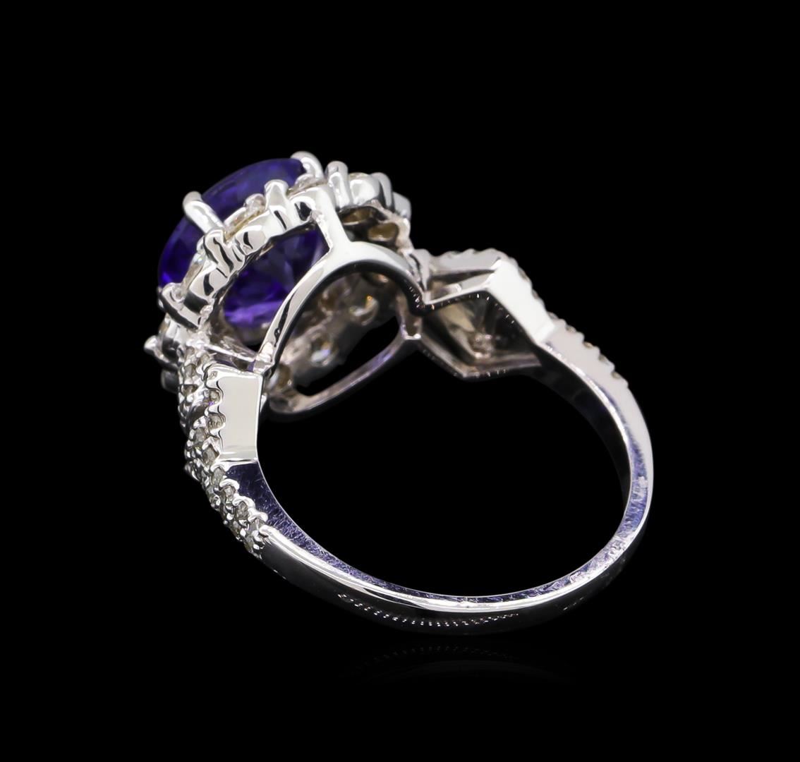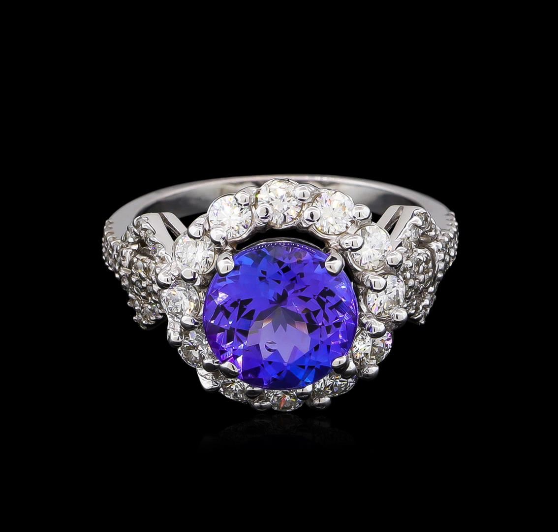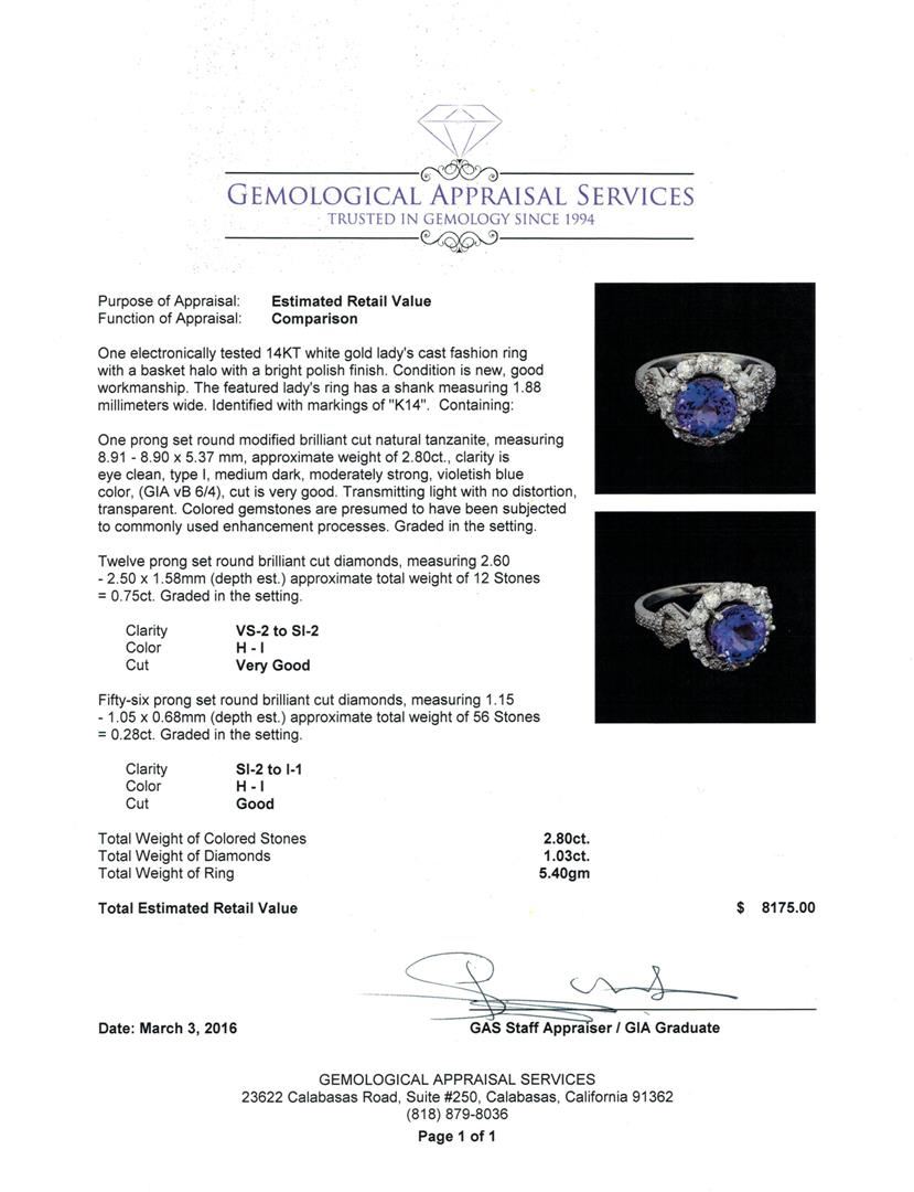 One electronically tested 14KT white gold lady's cast fashion ring with a basket halo with a bright polish finish. The featured lady's ring has a shank measuring 1.88 millimeters wide. Identified with markings of "K14". Condition is new, good workmanship. Containing: One prong set round modified brilliant cut natural tanzanite, measuring 8.91 - 8.90 x 5.37 mm, approximate weight of 2.80ct., clarity is eye clean, type I, medium dark, moderately strong, violetish blue color, (GIA vB 6/4), cut is very good. Transmitting light with no distortion, transparent. Colored gemstones are presumed to have been subjected to commonly used enhancement processes. Graded in the setting. Twelve prong set round brilliant cut diamonds, measuring 2.60 - 2.50 x 1.58mm (depth est.) approximate total weight of 12 Stones = 0.75ct. Graded in the setting. Clarity: VS-2 to SI-2. Color: H - I. Cut Very Good Fifty-Six prong set round brilliant cut diamonds, measuring 1.15 - 1.05 x 0.68mm (depth est.) approximate total weight of 56 Stones = 0.28ct. Graded in the setting. Clarity: SI-2 to I-1. Color: H - I. Cut Good. Total Weight of Colored Stones 2.80ct. Total Weight of Diamonds 1.03ct. Total Weight of Ring 5.40gm. GAS Appraised at $8,175.00.