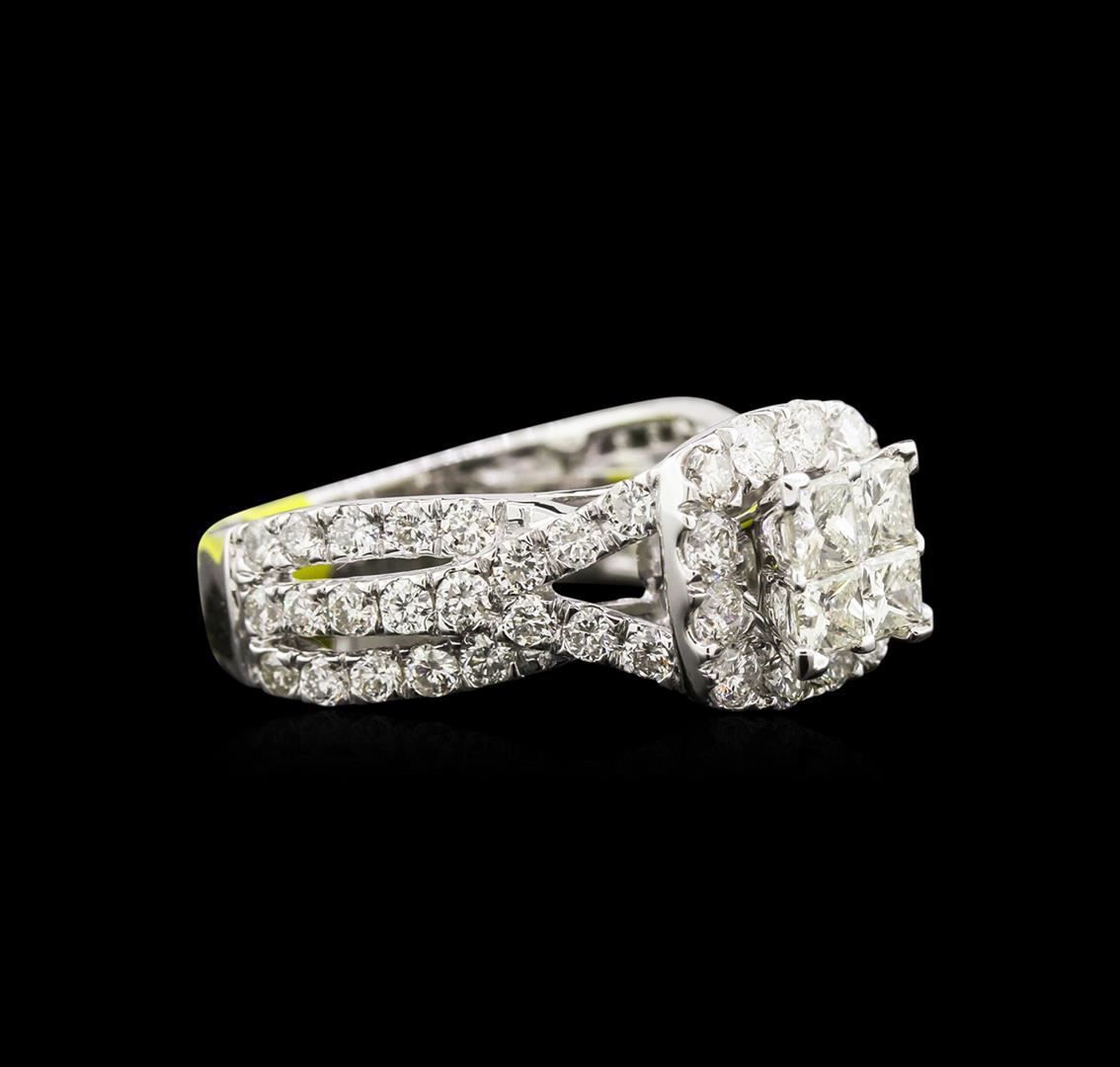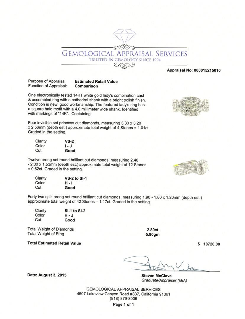 One electronically tested 14KT white gold lady's combination cast & assembled ring with a cathedral shank with a bright polish finish. The featured lady's ring has a square halo motif with a 4.0 millimeter wide shank. Identified with markings of "14K". Condition is new, good workmanship. Containing: Four invisible set princess cut diamonds, measuring 3.30 x 3.20 x 2.56mm (depth est.) approximate total weight of 4 Stones = 1.01ct. Graded in the setting. Clarity VS-2 Color I - Good Twelve prong set round brilliant cut diamonds, measuring 2.40 - 2.30 x 1.53mm (depth est.) approximate total weight of 12 Stones = 0.62ct. Graded in the setting. Clarity VS-2 to SI-1 Color H - I. Cut Good Forty-Two split prong set round brilliant cut diamonds, measuring 1.90 - 1.80 x 1.20mm (depth est.) approximate total weight of 42 Stones = 1.17ct. Graded in the setting. Clarity SI-1 to SI-2 Color H - Good Total Weight of Diamonds 2.80ct. Total Weight of Ring 5.80gm GAS Appraised at $10,720.00.