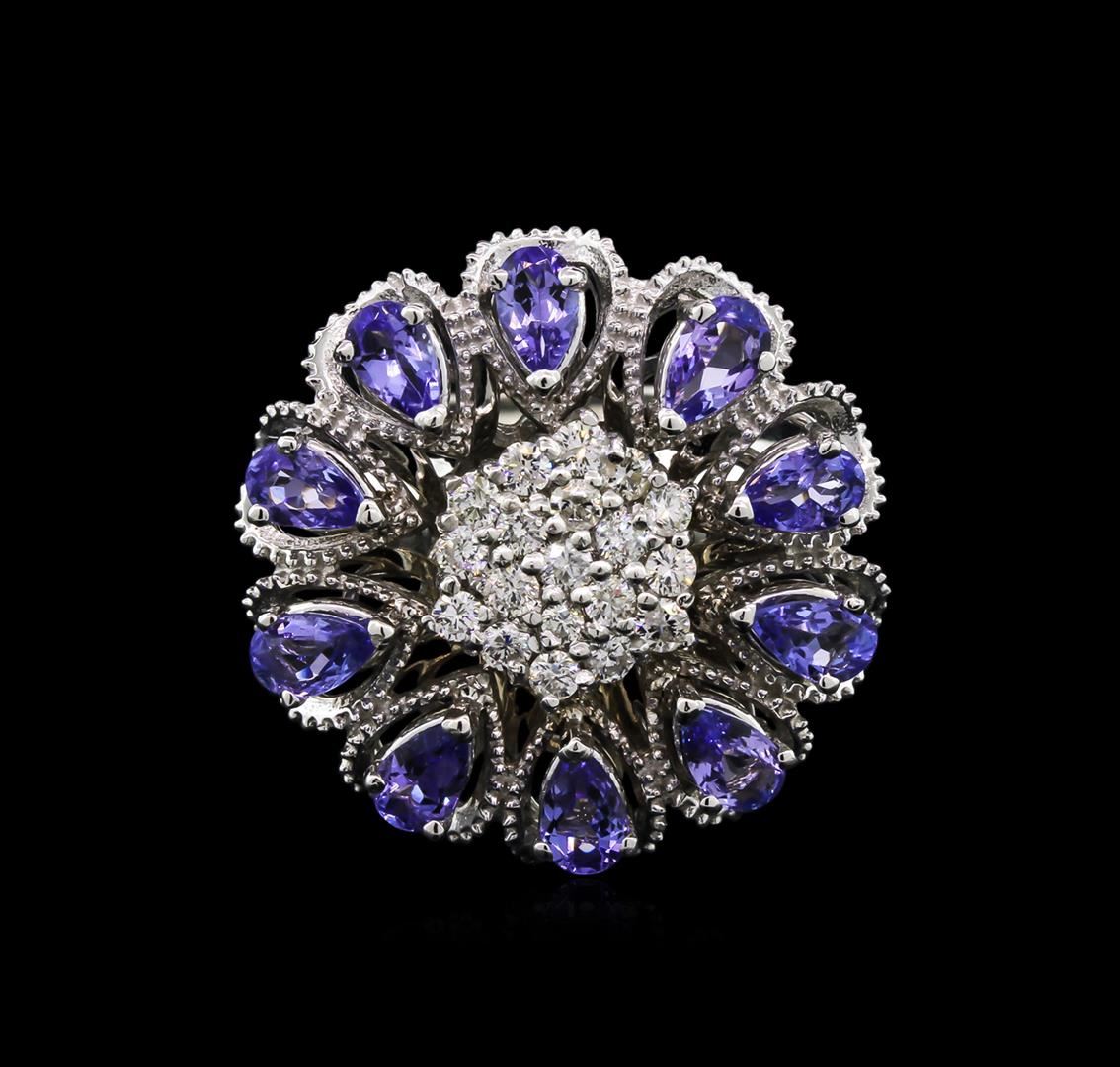 One electronically tested 14KT white gold lady's cast fashion ring with a bright polish finish. The featured ladies ring has a large floral motif with a shank measuring 3.77 millimeters in width. Identified with markings of "14K". Condition is new, good workmanship. Containing: Ten prong set pear modified brilliant cut natural tanzanites, measuring 5.50 x 3.20 x 2.40mm, approximate total weight of 2.80ct., clarity is eye clean, type I, medium light, very slightly grayish, bluish violet color, (GIA bV 4/3), cut is good. Transmitting light with no distortion, transparent. Colored gemstones are presumed to have been subjected to commonly used enhancement processes. Graded in the setting. Twenty prong set round brilliant cut diamonds, measuring 2.00 - 1.90 x 1.27mm (depth est.) approximate total weight of 20 Stones = 0.60ct. Graded in the setting. Clarity: SI-2 to I-1. Color: H - I. Cut Good. Total Weight of Colored Stones 2.80ct. Total Weight of Diamonds 0.60ct. Total Weight of Ring 10.10gm. GAS Appraised at $5,260.00.