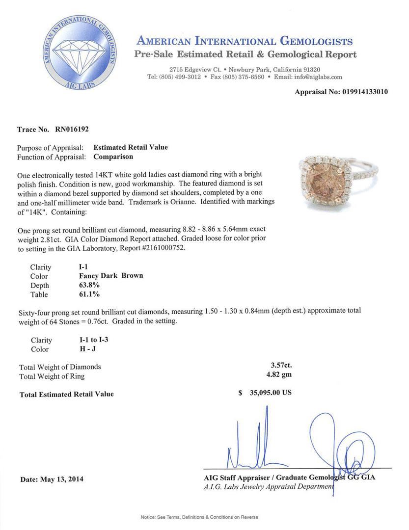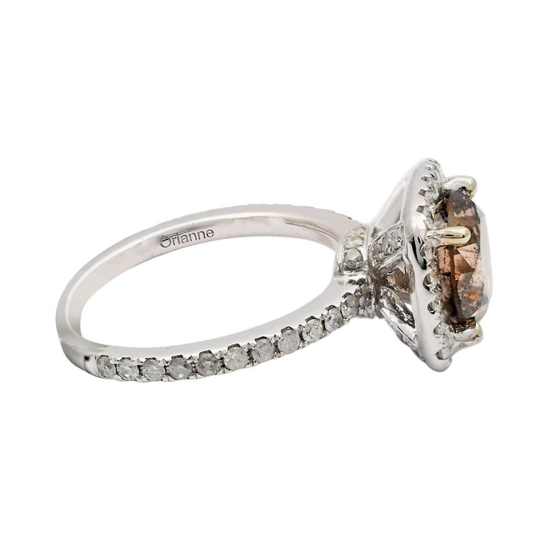 One electronically tested 14KT white gold ladies cast diamond ring with a bright polish finish. The featured diamond is set within a diamond bezel supported by diamond set shoulders, completed by a one and one-half millimeter wide band. Trademark is Orian